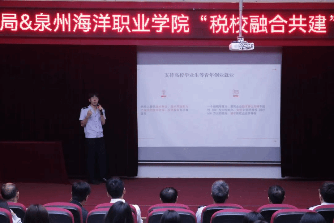 石狮市税务局宣讲团青年骨干叶炜杰同志为在场师生进行了税法宣讲。在宣讲过程中,叶炜杰同志深入阐述了税法知识对于促进大学生就业创业的重要性。他强调,无论是选择就业还是自主创业,了解税法知识都是必不可少的。对于就业的大学生来说,了解个人所得税、社会保险等相关税收政策,有助于他们合理规划个人财务,保障自身权益,而对于创业的大学生来说,掌握企业所得税、增值税等税收政策,则能够帮助他们更好地规避风险,提高经营效益。