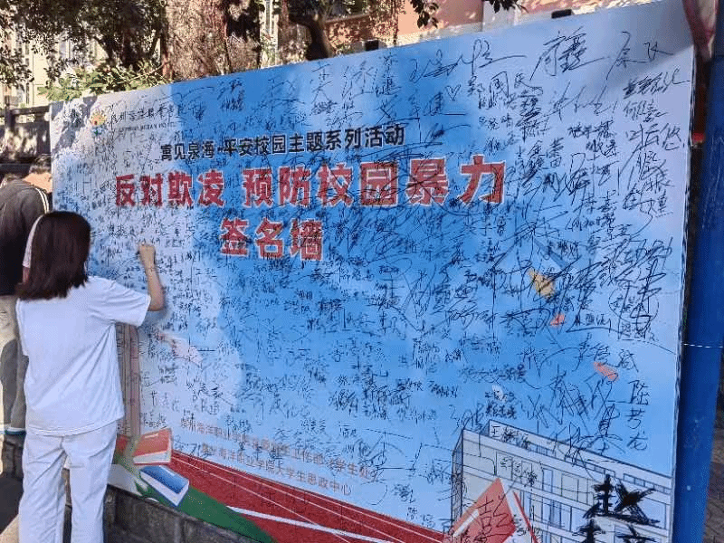 在“反霸防欺墙”,同学们用温暖的话语传递爱心,郑重签下自己的承诺和姓名,共同营造一个无霸凌的校园环境。