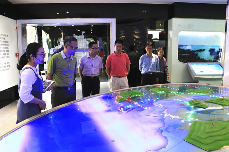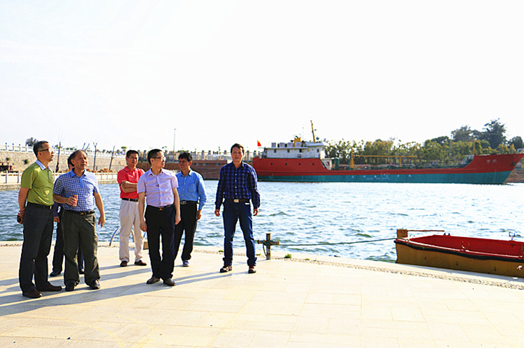 施国宾局长一行在林华东院长等校领导的陪同下先后实地参观了学院海丝文化墙、轮机实训中心、空乘实训舱、育航号实训船、科技展览馆和世界特种船舶展示厅等。
