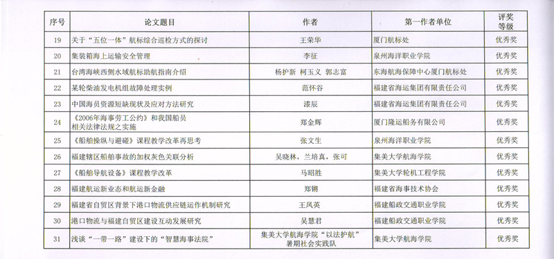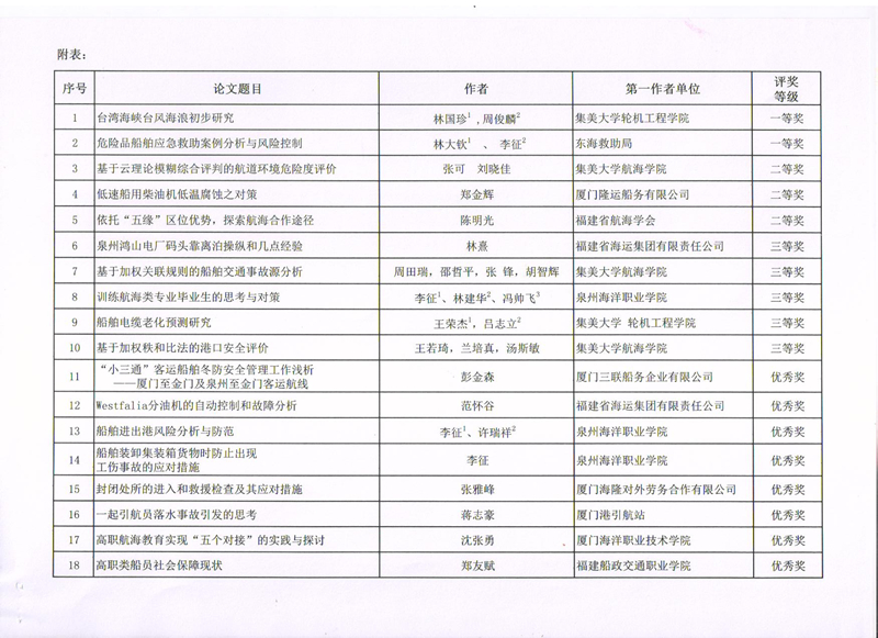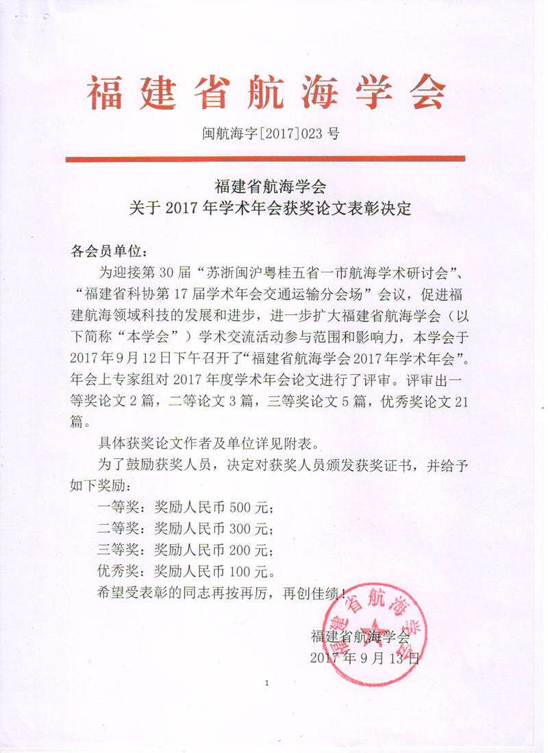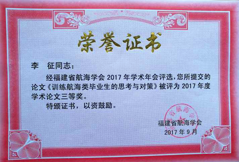 新闻中心讯(党政办编辑) 9月12日,福建省航海学会召开学会2017年学术年会,年会上专家组对2017年度学术年会论文进行评审。近日,福建省航海学会发布闽航海字【2017】023号文件《福建省航海学会关于2017年学术年会获奖论文表彰决定》,我院航海系李征老师参与的《危险品船舶应急救助案例分析与风险控制》与《训练航海类专业毕业生的思考与对策》分获论文评比的一、三等奖。