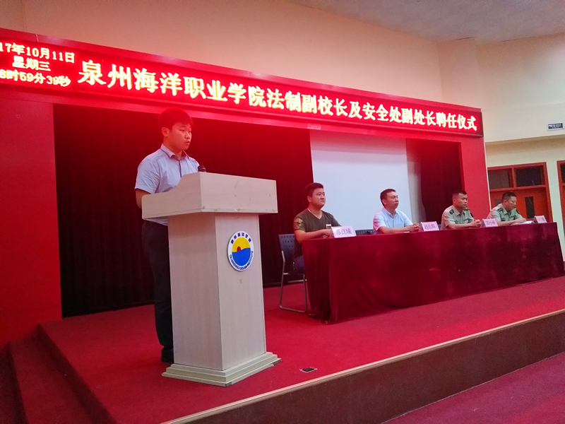 校园安全是社会安全工作的重要组成部分,它直接关系到青少年学生能否安全、健康地成长,关系到千千万万个家庭的幸福安宁和社会稳定。为了更好的维护校园安全,共筑平安校园,赵山辉副院长代表学院聘请郭小林副所长担任泉州海洋职业学院法制副校长,缪仕雄警官担任泉州海洋职业学院安全处副处长。根据工作安排,缪仕雄警官之后将常驻我院,共同打造平安和谐校园。
