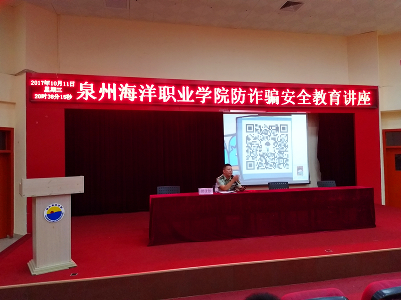 聘任仪式结束后,由安全处副处长缪仕雄警官为同学们连续开展两场做防诈骗主题讲座。缪警官向同学们详细介绍了诈骗的形式和常用手段,他根据自己的工作经验和体会,针对当前高校电信网络诈骗和校园贷案件频发的情况,通过丰富的案例和详实的数据,详细讲述了网购诈骗、中奖诈骗、短信诈骗和刷单诈骗的作案手法、危害性及防范方法,提醒同学们要充分认识网络诈骗的真实面目,要积极宣传普及网络诈骗知识,不断增强安全意识,提高自我保护能力,学会用正确的方法应对各类危害行为,确保财产及人身安全不受侵害。缪警官特别指出骗子喜欢利用大家“软肋”进行诈骗的事实,告诫同学们一定要擦亮眼睛,不要轻易相信网络、电话、生活中的陌生人所提出的各种诱惑条件,真正练就一双准确判断是非善恶美丑的“火眼金睛”。讲座过程中,缪警官创建了“校园阿sir”微信公众号,通过丰富的经典案件,分解剖析根源,为每个学生开设安全知识的直通车。
