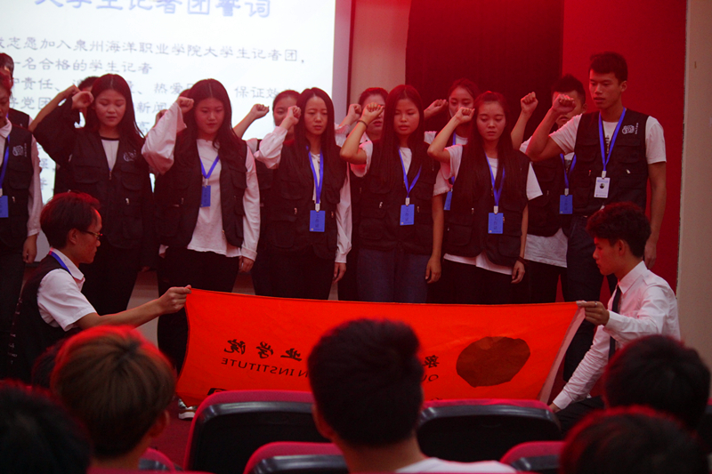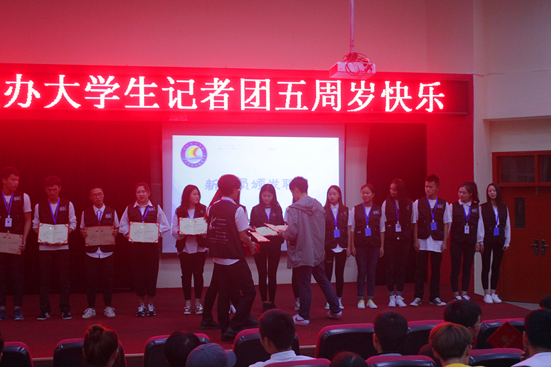 在进行新一届成员宣誓后,继续教育学院柯阿斌老师为孙文轩、黄剑斌等优秀上届团员颁发了荣誉证书;党政办柯银杰老师也现场给大一新团员颁发了聘任证书。最后,由柯阿斌老师与刘佳泽老师上台切分蛋糕,与现场所有师生分享,并一同祝贺记者团生日快乐。
