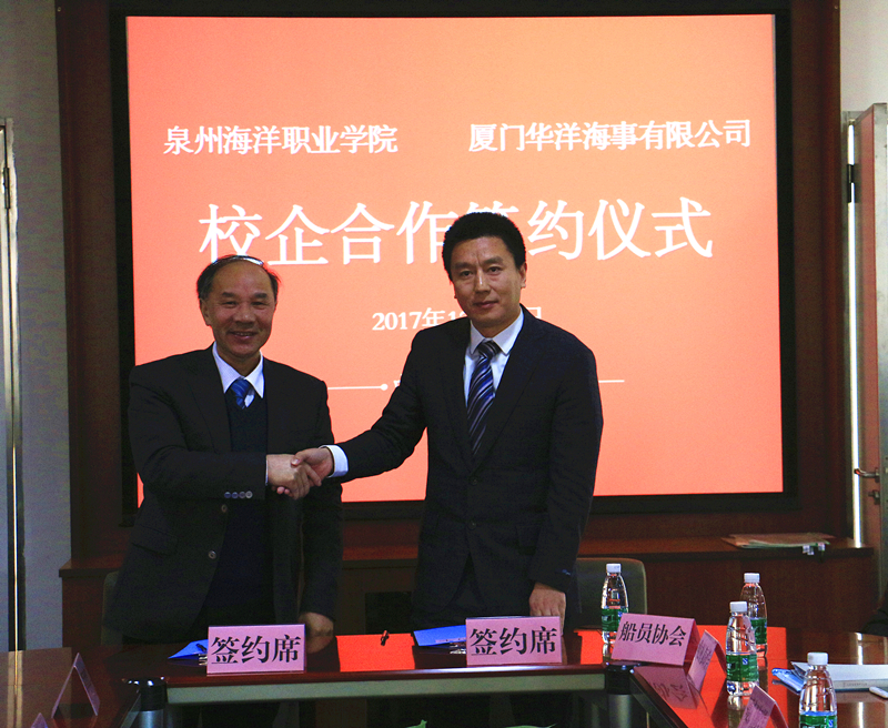 新闻中心讯(党政办编辑)近日,在我院承办福建省船员服务行业协会换届大会之际,我院与厦门华洋海事有限公司校企合作协议在我院举行。学院林华东院长与厦门华洋海事有限公司胡从池总经理分别代表双方签署校企合作协议。