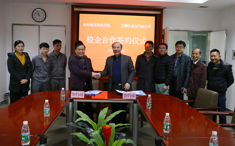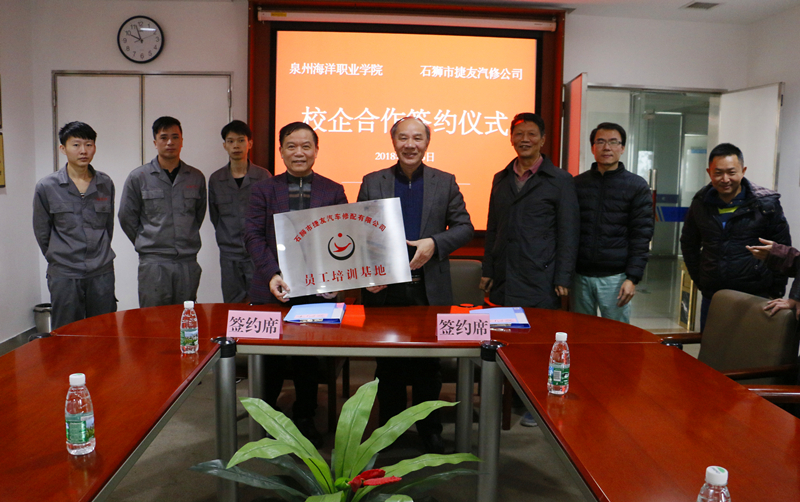 石狮市捷友汽车修配有限公司刘永康董事长表示“企业将为泉州海洋职业学院的汽修专业学生创造更为丰富而实效的实习条件。让同学们将学习的理论知识通过企业实训转化为有效的专业技能和生产力,掌握扎实过硬的本领,将来自信的走向职场。同时,期待校企合作工程做实、做强、做大,实现学生、学校、企业三方共赢,为地区汽车经济做出应有的行业贡献。
