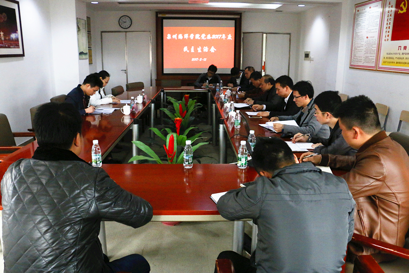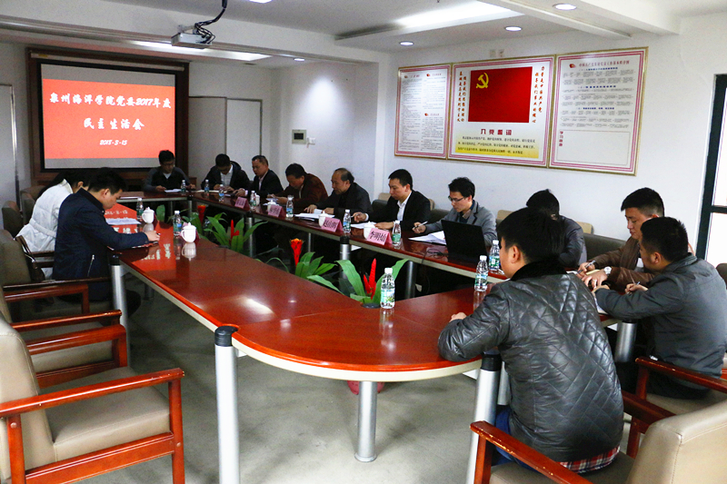 新闻中心讯(党政办编辑)中共泉州海洋职业学院委员会于2018年3月15日在学院行政楼三楼大会议室召开2017年度民主生活会。受中共泉州市委教育工委委派,泉州市教育局副调研员陈永洁、泉州市计财科科长黄小箐亲临会议督导。学院党委书记林华东同志代表党委班子作对照检查,并汇报了本次民主生活会的相关前期准备情况及2016年度“两学一做”专题民主生活会的整改落实情况。随后,林华东、赵山辉、郑文谦和李明灿等四位班子成员先后做了汇报发言,深刻剖析自己,相互坦诚交心,深入开展批评和自我批评。
