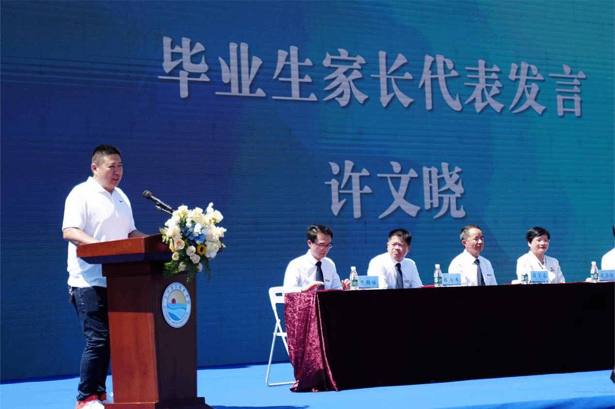 许文晓先生代表全体毕业生家长发言。他向全体毕业生们表示祝贺,并对学校的培养和老师的教导表达了感谢。他谈道,三年的大学生活既是一段充满挑战和磨砺的旅程,也是一段收获知识和成长的时光,这些宝贵的经历将会成为孩子们成长道路的宝贵财富。希望泉海学子在面对挑战与困难时,保持学习的热情不断进取,勇往直前,在未来的人生中,铭记母校的校训和老师的期望,做一个有知识、有品德、有担当的人。