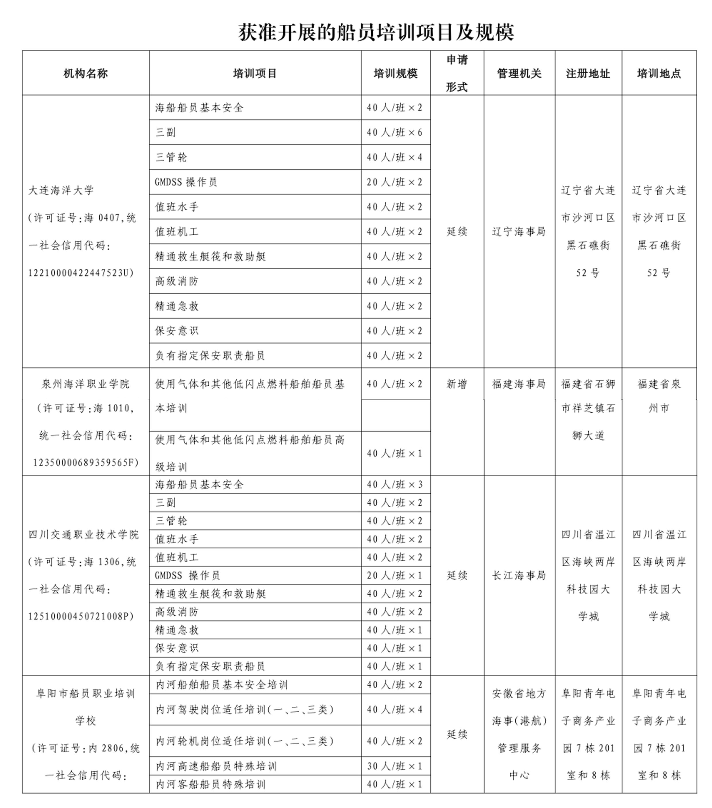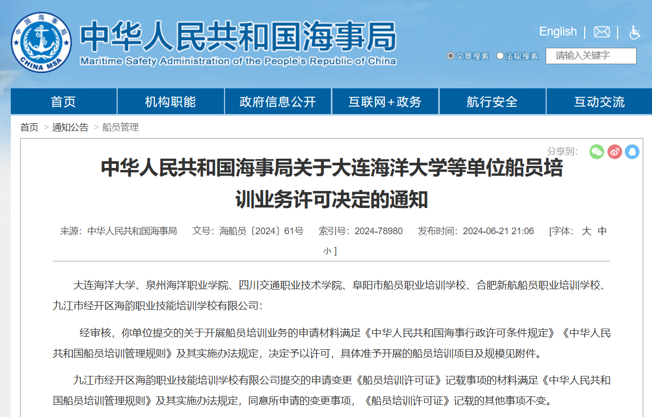 《关于大连海洋大学等单位船员培训业务许可决定的通知》(海船员函〔2024〕971号)