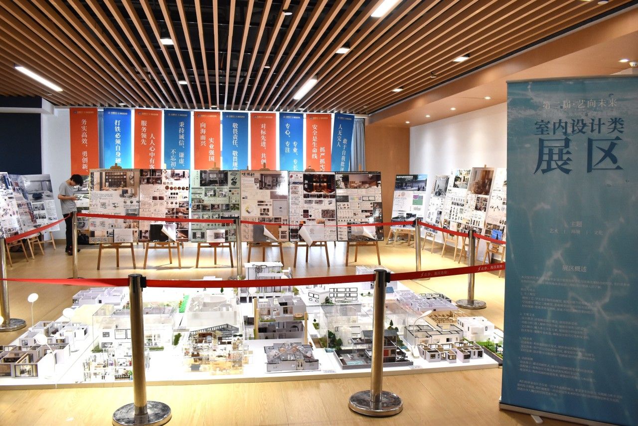 毕业设计展的布展现场遵循“绿色环保”的核心理念,通过运用纸箱材料进行布展搭建,不仅确保了现场布局的规整有序,更体现了对环保理念的深入践行。