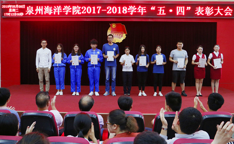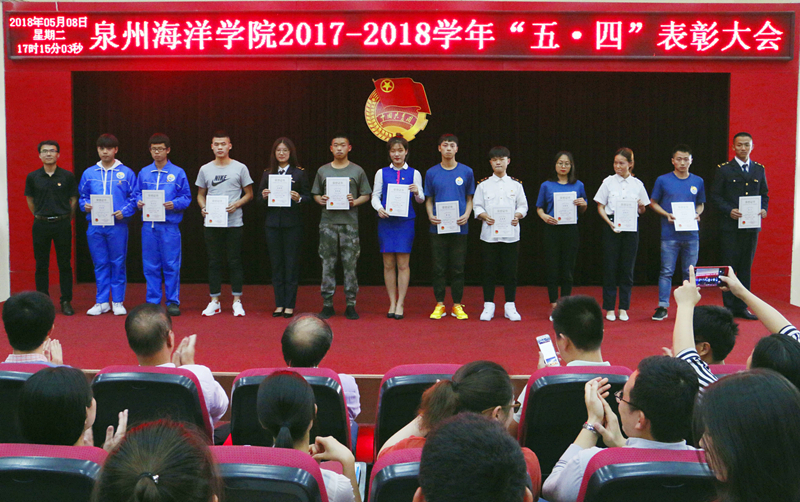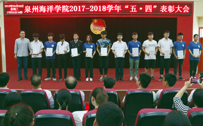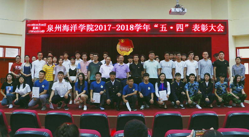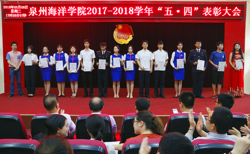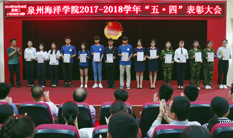 新闻中心讯(记者团供稿 党政办编辑)为深入学习贯彻习近平新时代中国特色社会主义思想和党的十九大精神,依照共青团“凝聚青年、服务大局、当好桥梁、从严治团”的四维工作格局,并号召广大团员青年自觉投身学院新一轮改革发展的伟大实践,为实现学院快速发展作出贡献,5月8日下午,由泉州海洋职业学院团委主办的“2017—2018学年‘五·四’表彰大会”于我院多功能报告厅如期举行。学院党委书记、院长林华东教授以及学院各党支部书记、支委出席了本次大会。