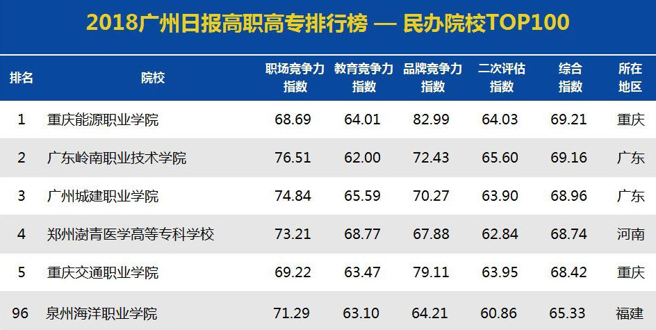 新闻中心讯(党政办编辑) 近日,广州日报数据和数字化研究院(GDI)发布“2018广州日报高职高专排行榜”,以职场竞争力指数、教育竞争力指数、品牌竞争力指数和二次评估指数四个一级指标建构综合指数,科学评价国内1388所高职高专,推出“2018广州日报高职高专排行榜—TOP1000”以及“2018广州日报高职高专排行榜—民办院校TOP100”等五个子榜单。