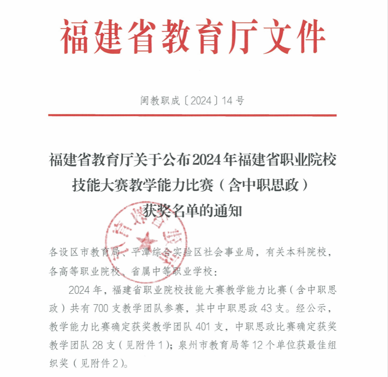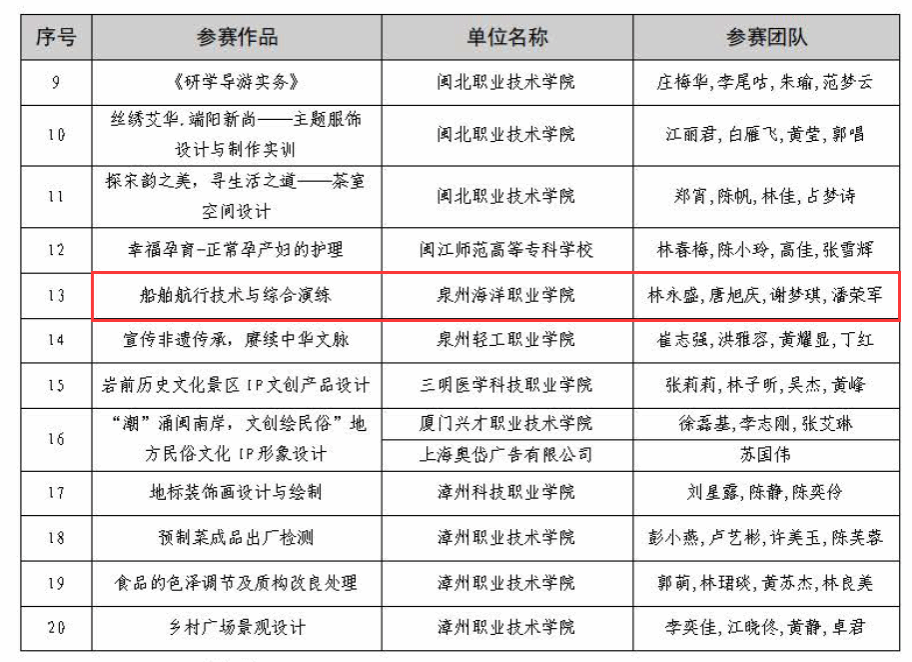 (新闻中心讯 教务处供稿 校党委宣传部报道)近日,福建省教育厅发布了2024年福建省职业院校技能大赛教学能力比赛(含中职思政)的拟获奖名单。在经过严格的网络初评和激烈的现场决赛后,共有401个教学团队脱颖而出。在此竞争中,学校航海交通学院的林永盛、唐旭庆、谢梦琪、潘荣军四位教师凭借作品《船舶航行技术与综合演练》荣获大赛二等奖,为学校赢得了荣誉。