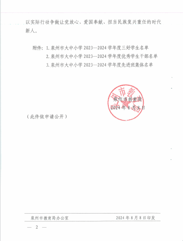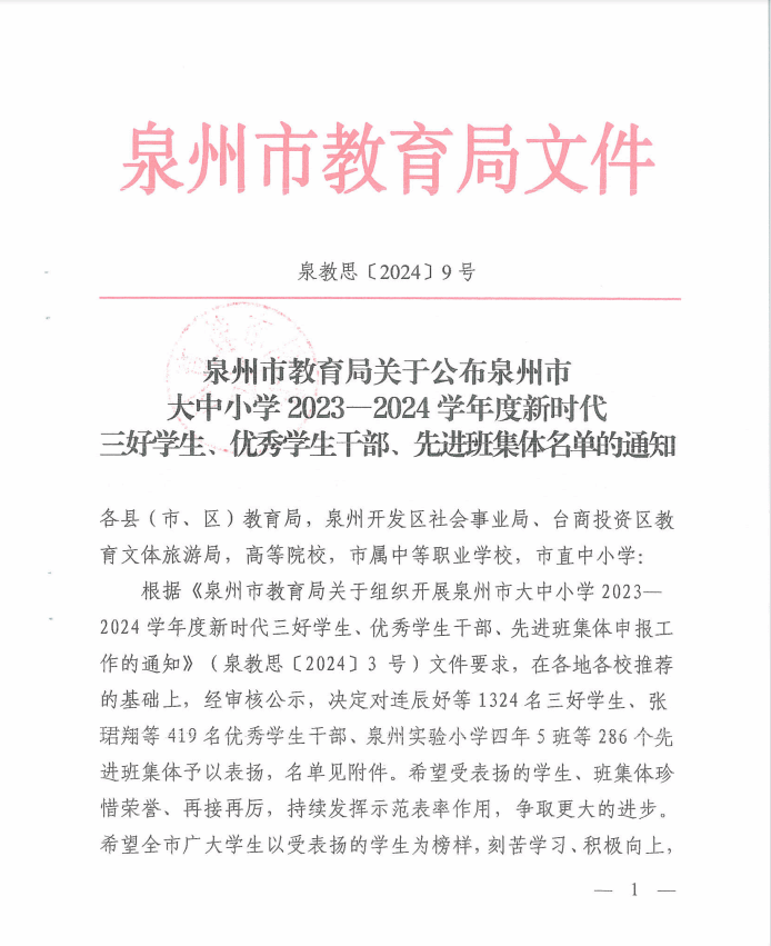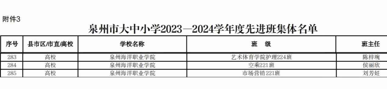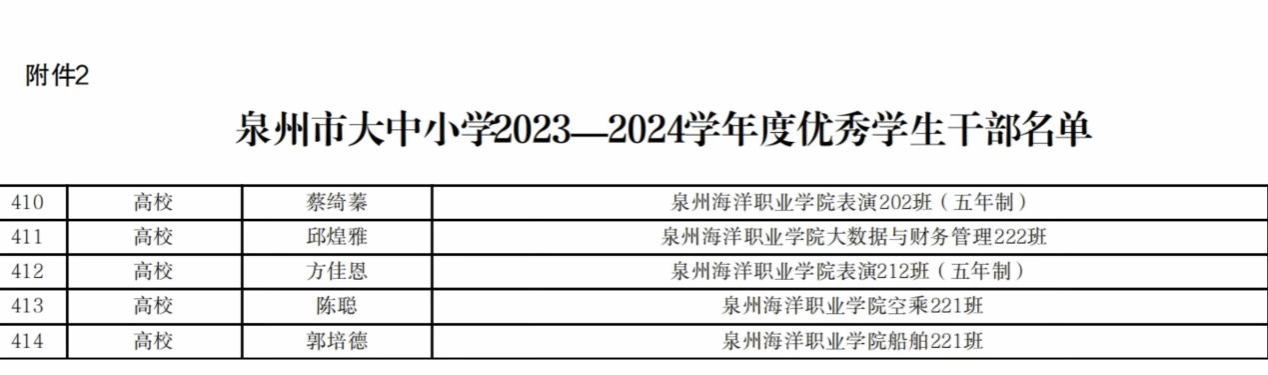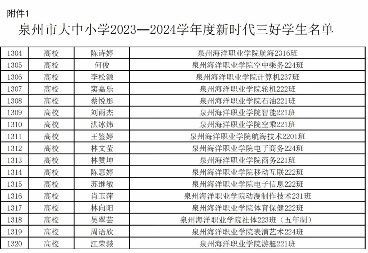 (新闻中心讯 党委学工部黄安娜供稿 校党委宣传部报道)近日,泉州市教育局公布泉州市大中小学2023-2024学年度新时代三好学生、优秀学生干部、先进班集体名单。经过学生自荐、二级学院推荐、学校推荐申报、教育局审核公示,我校共17名学生荣获泉州市三好学生、5名学生荣获优秀学生干部,3个班级荣获优秀班集体荣誉称号。