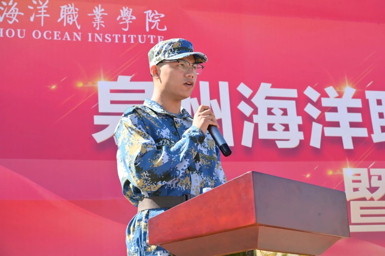 艺术体育学院丘杭杰代表2024级新生发言。他表示“宝剑锋从磨砺出,梅花香自苦寒来”,他将与在场同学携手并进,在军训中锤炼自己,用汗水浇灌希望,用坚持铸就辉煌!