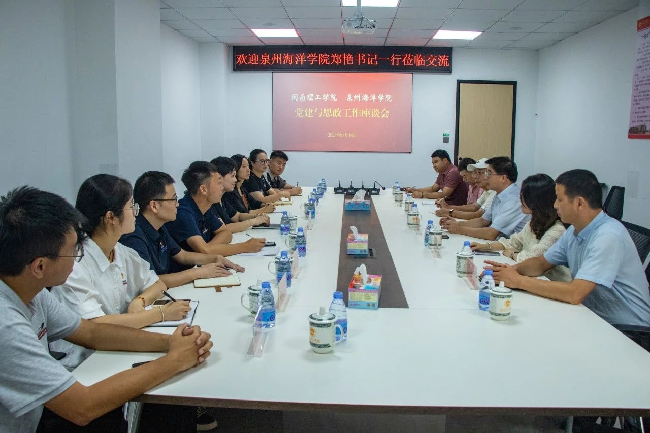 (新闻中心讯 党委宣传部供稿 校党委宣传部报道)为深入学习领会习近平新时代中国特色社会主义思想,进一步扩大党建联建“朋友圈”,深化校际党建交流合作,9月18日,校党委书记郑艳率党委职能部门成员与闽南理工学院党委开展党建共建交流。闽南理工学院党委书记林志凯,纪委书记、校长助理、教师工作部部长姜鼎煌,党委委员、校长助理庄林议及党委职能部门成员参与活动。