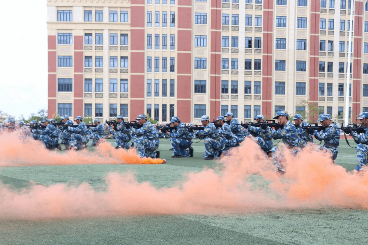 表演方队各出奇招,展青年风采。经济管理学院方队整齐划一地表演着刺杀操,每一个动作都显得精准有力;海洋工程学院方队展示了旗开得胜的壮观场面,旗帜在空中飘扬,象征着胜利的喜悦和荣誉;信息工程学院方队充满了力量和技巧的军体拳,展现了当代青年的坚韧;航海交通学院战术动作方队展示了战术中常见的七个动作,整齐划一,充分体现当代青年战术素养;艺术体育学院精心模拟了真实的战场环境,于浓烟滚滚的氛围中展现了团队协作的精神。