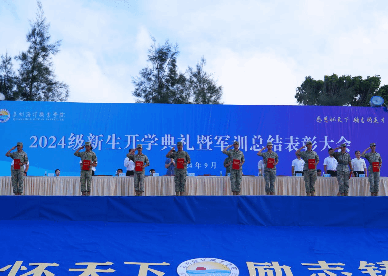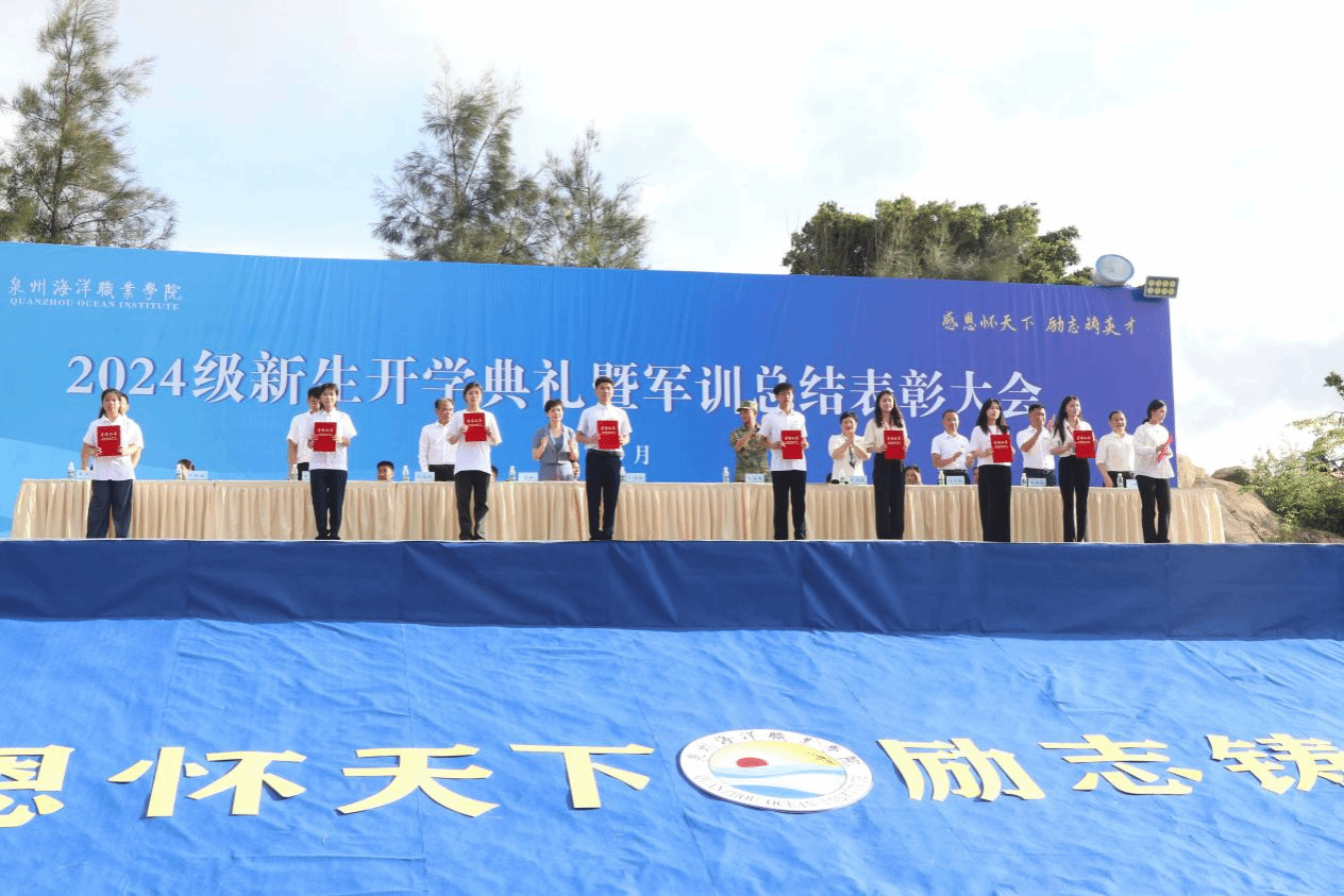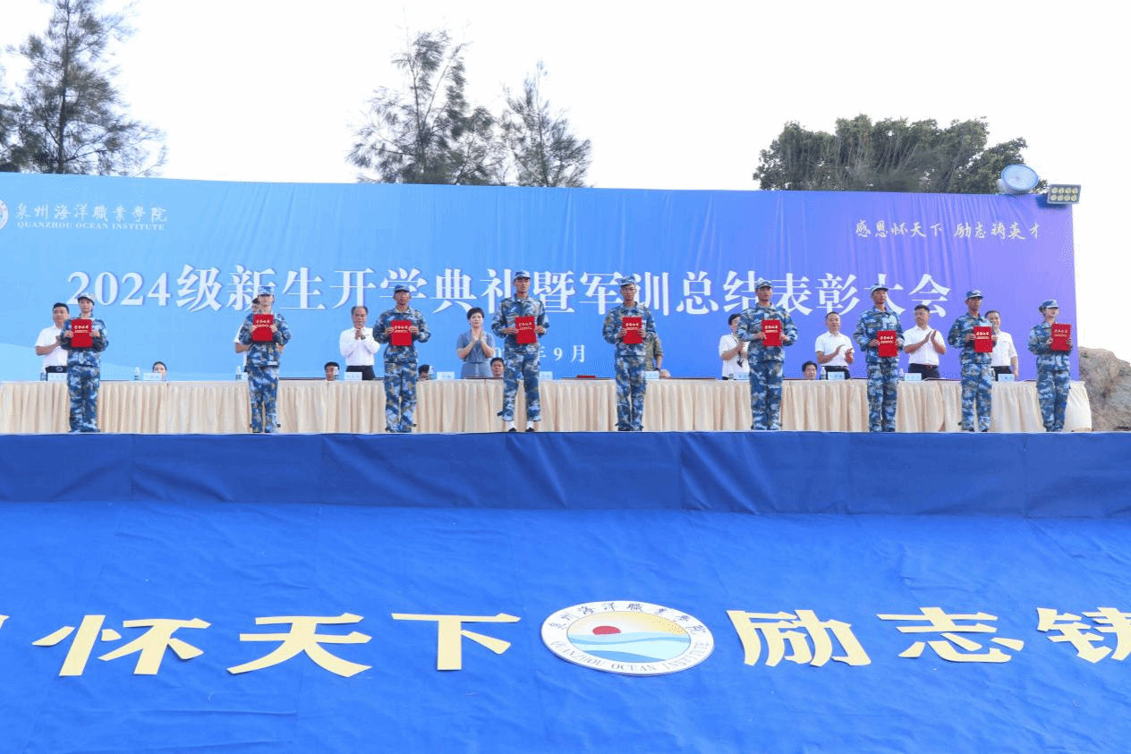 军训工作办公室主任、学工部部长张君宣读《泉州海洋职业学院关于表彰2024年新生军训优秀教官、优秀标兵、优秀组织单位的决定》。