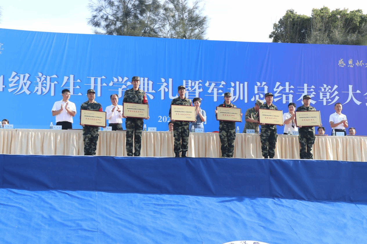 校领导为新生军训优秀教官、优秀标兵、优秀组织单位颁奖。