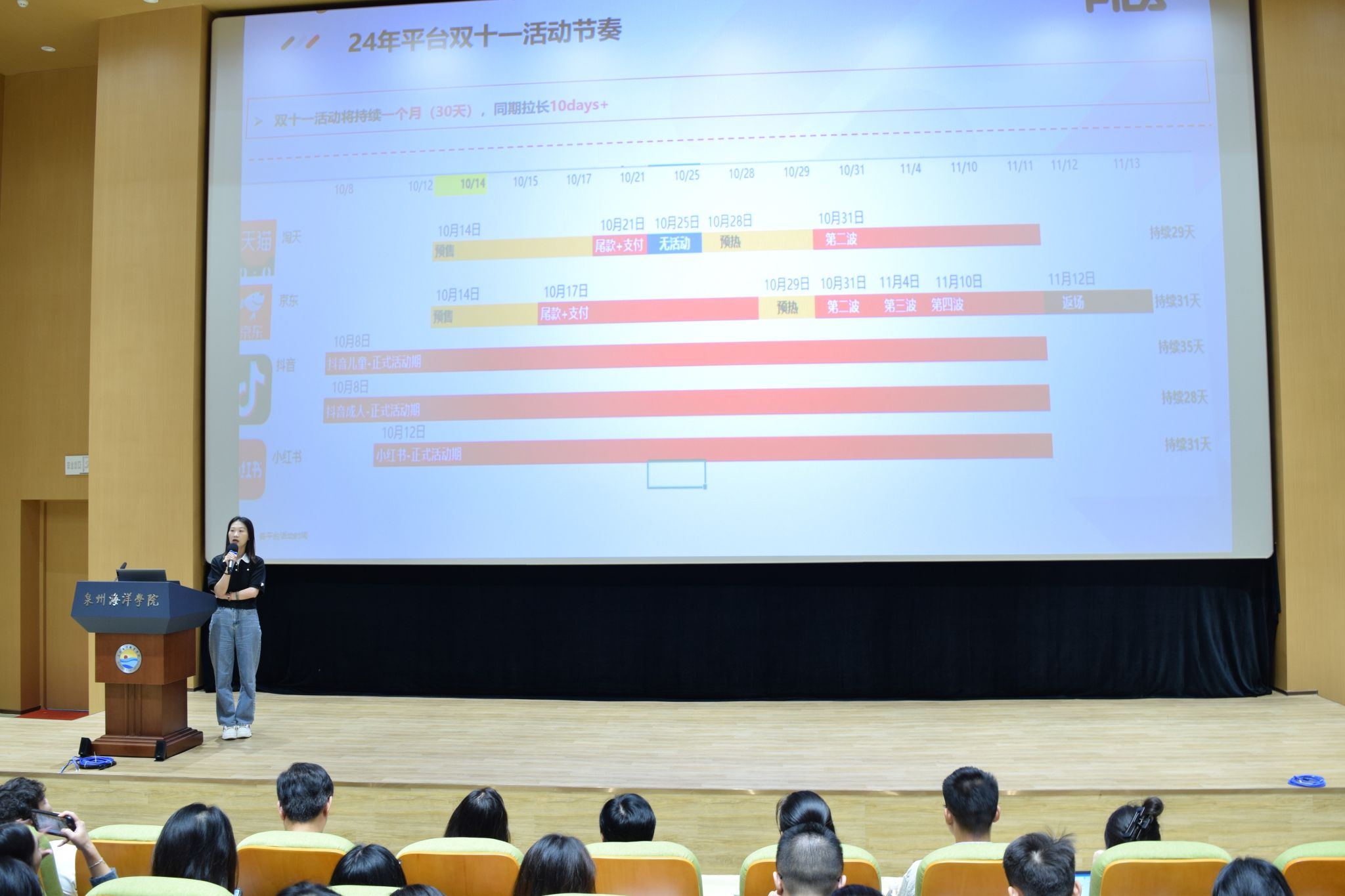 安踏斐乐代表黄皇冠以生动的语言详细讲述了“双十一”的发展历程。她谈到,“双十一”从最初的一个普通日子,逐渐演变未全球瞩目的购物狂欢节,背后蕴含着无数的商业智慧与创新理念。目前,安踏斐乐企业全力支持学生的实践活动,将为广大学生提供丰富的资源与专业的指导,为学生的成长成才助力。