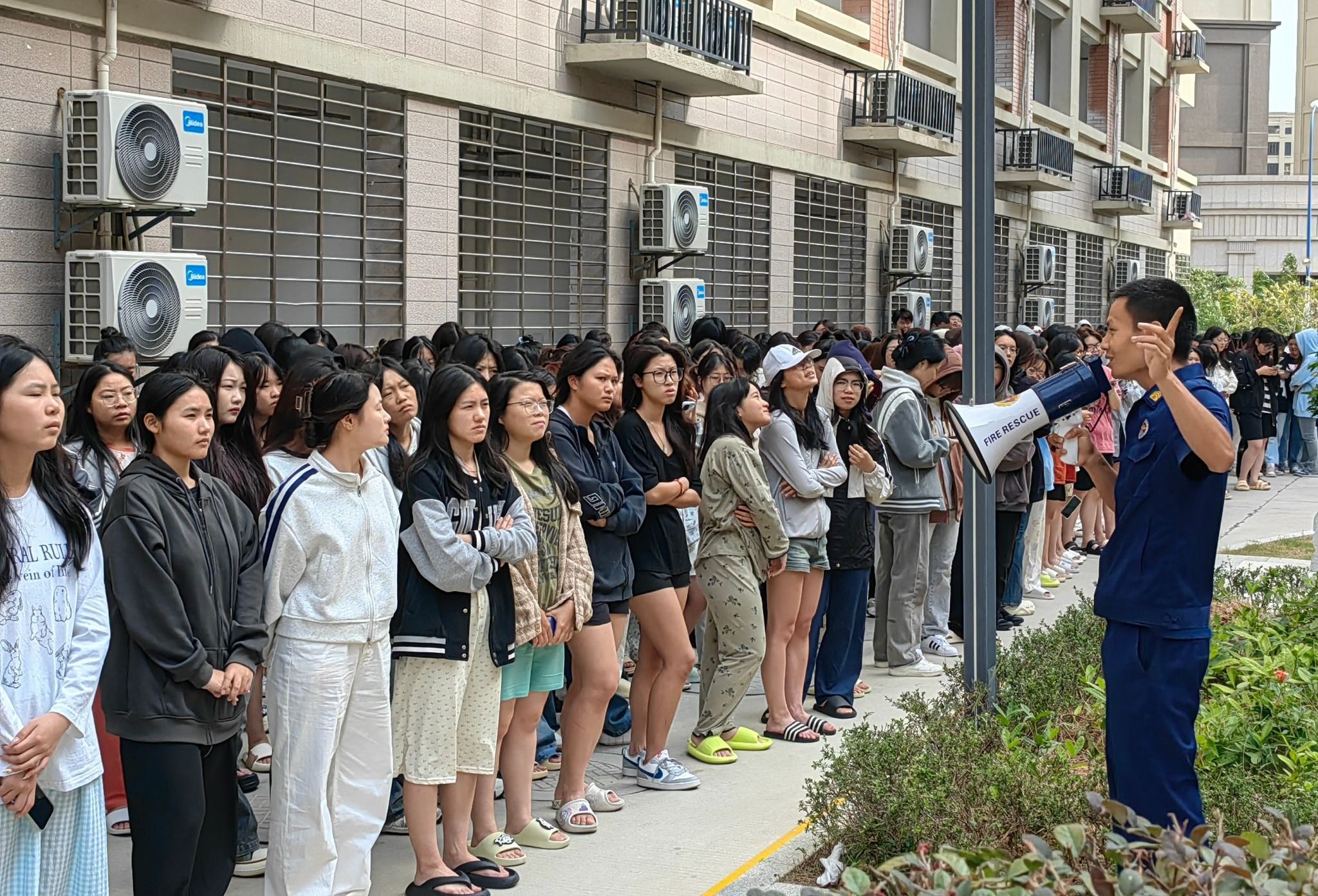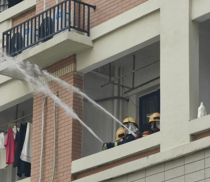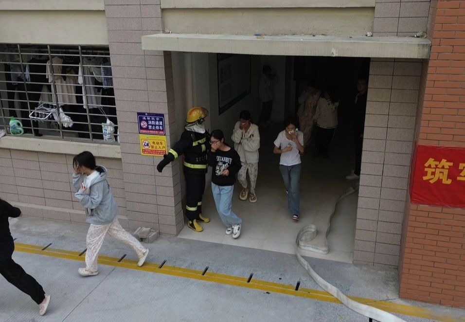 演练开始后,随着火情警报响起,同学们在辅导员的指引下,用手捂住口鼻,弯腰低姿前行,按照预定的疏散路线迅速有序从宿舍撤离。鸿山救援站队员接警后,消防车也迅速赶到学校6号学生宿舍楼开展实战灭火演练。现场,消防队员们分工明确,迅速行动,一组队员铺设水带,连接消火栓,进行灭火作业,另一组队员则携带专业救援设备,冲向宿舍楼展开救援行动,迅速扑灭“火情”。