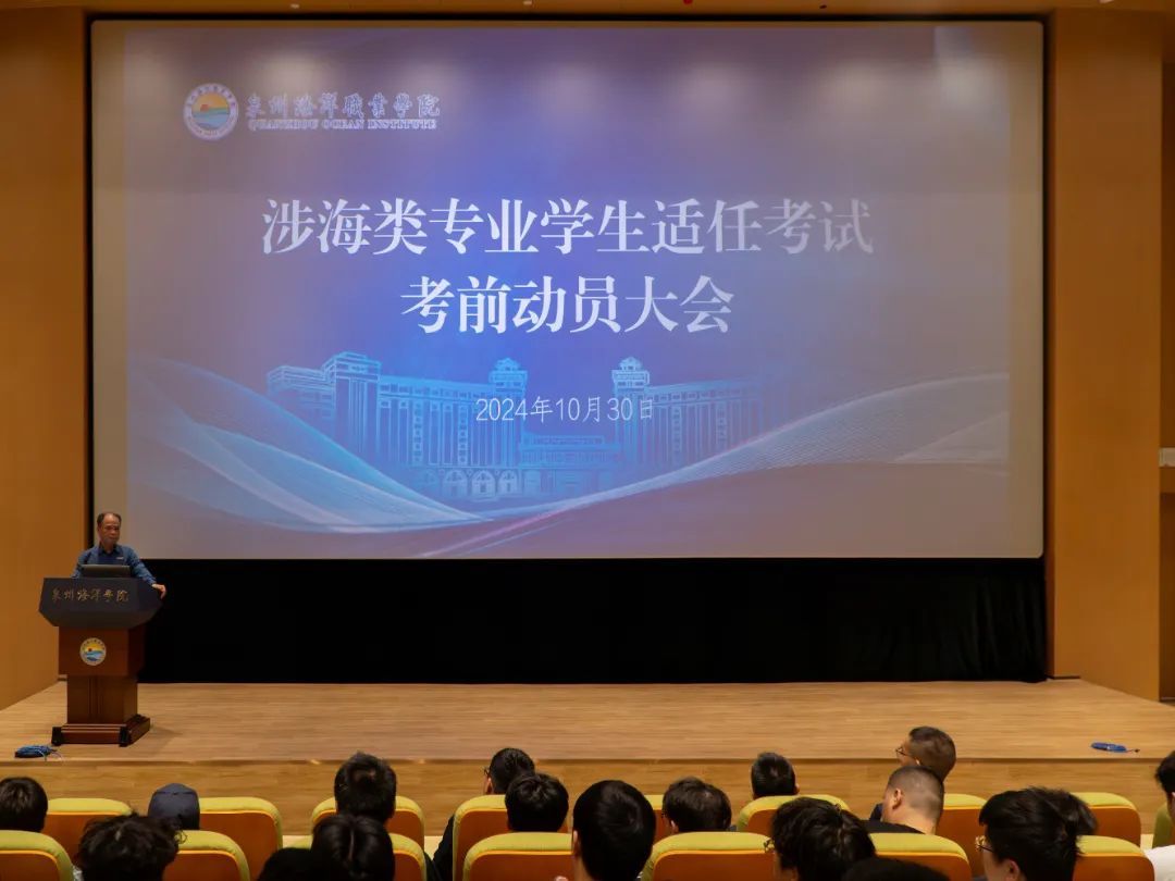 (新闻中心讯 海洋工程学院供稿 党委宣传部报道)10月30日,泉州海洋职业学院涉海类专业学生适任考试考前动员大会在图书馆2楼报告大厅召开。副校长刘锦辉,海洋工程学院、航海交通学院相关负责人,以及涉海类专业辅导员共同参加大会。