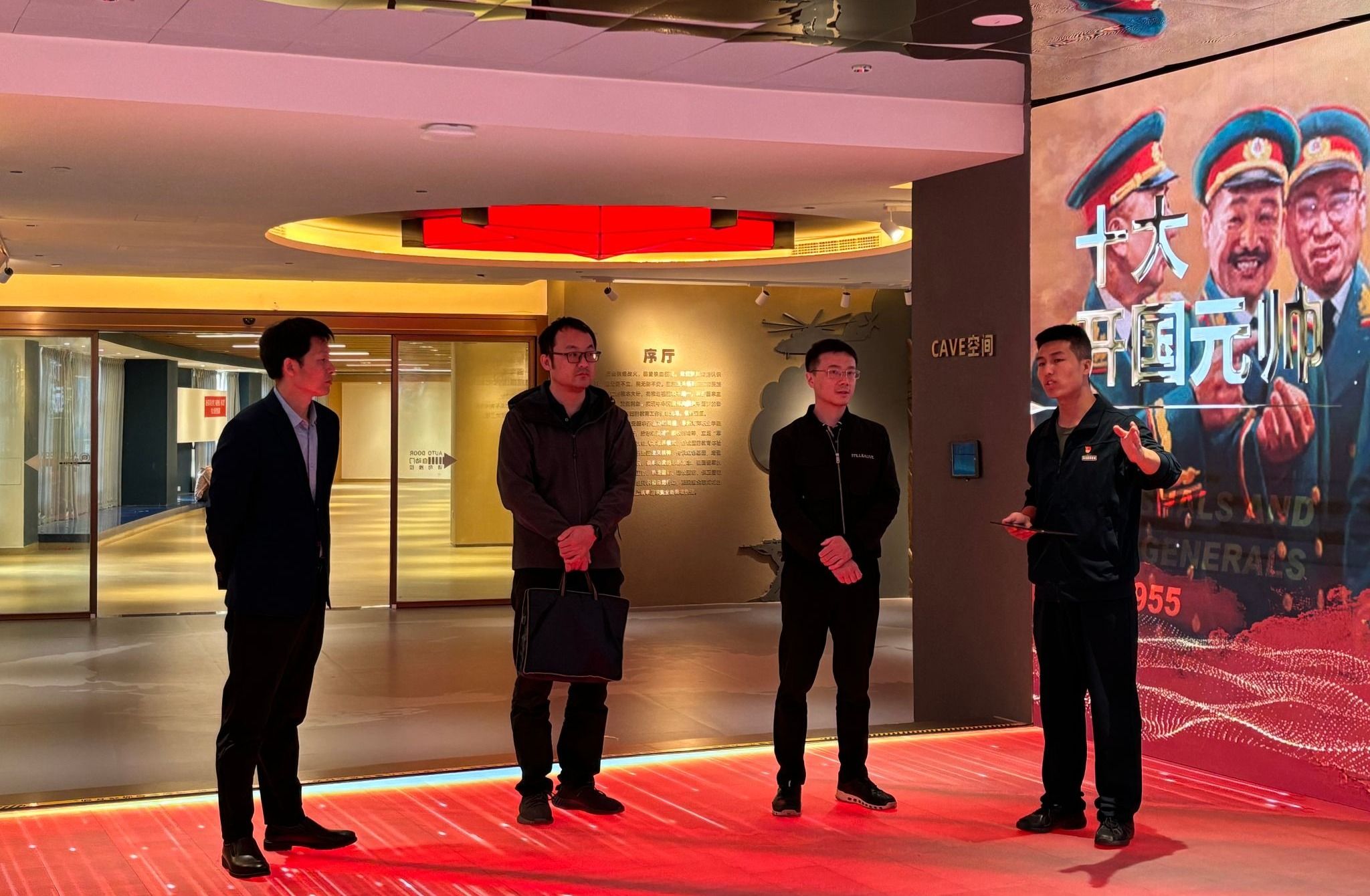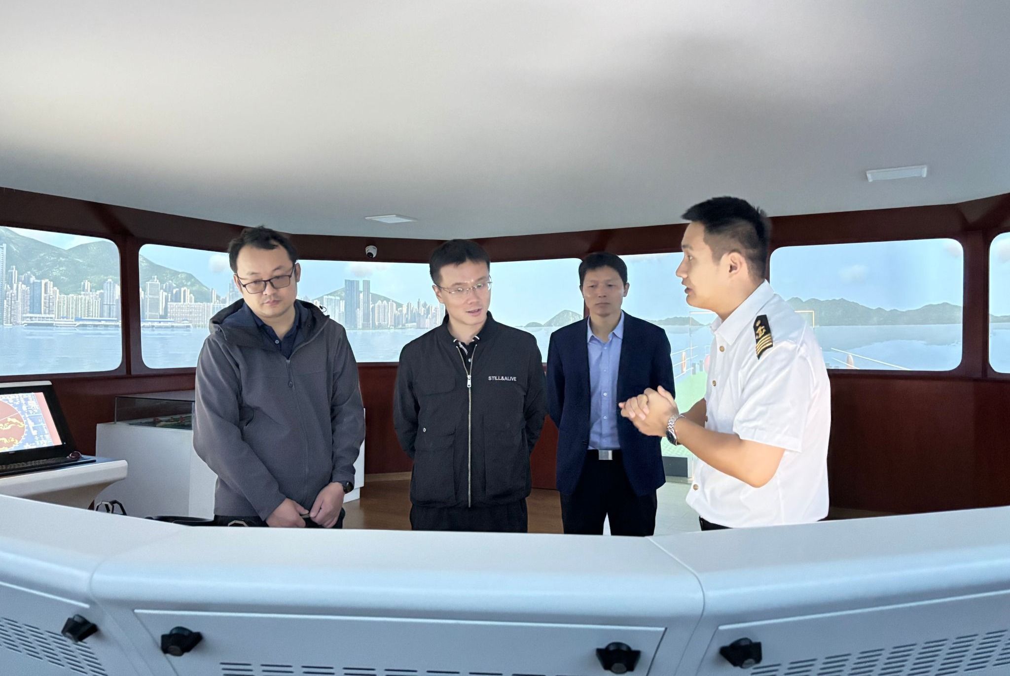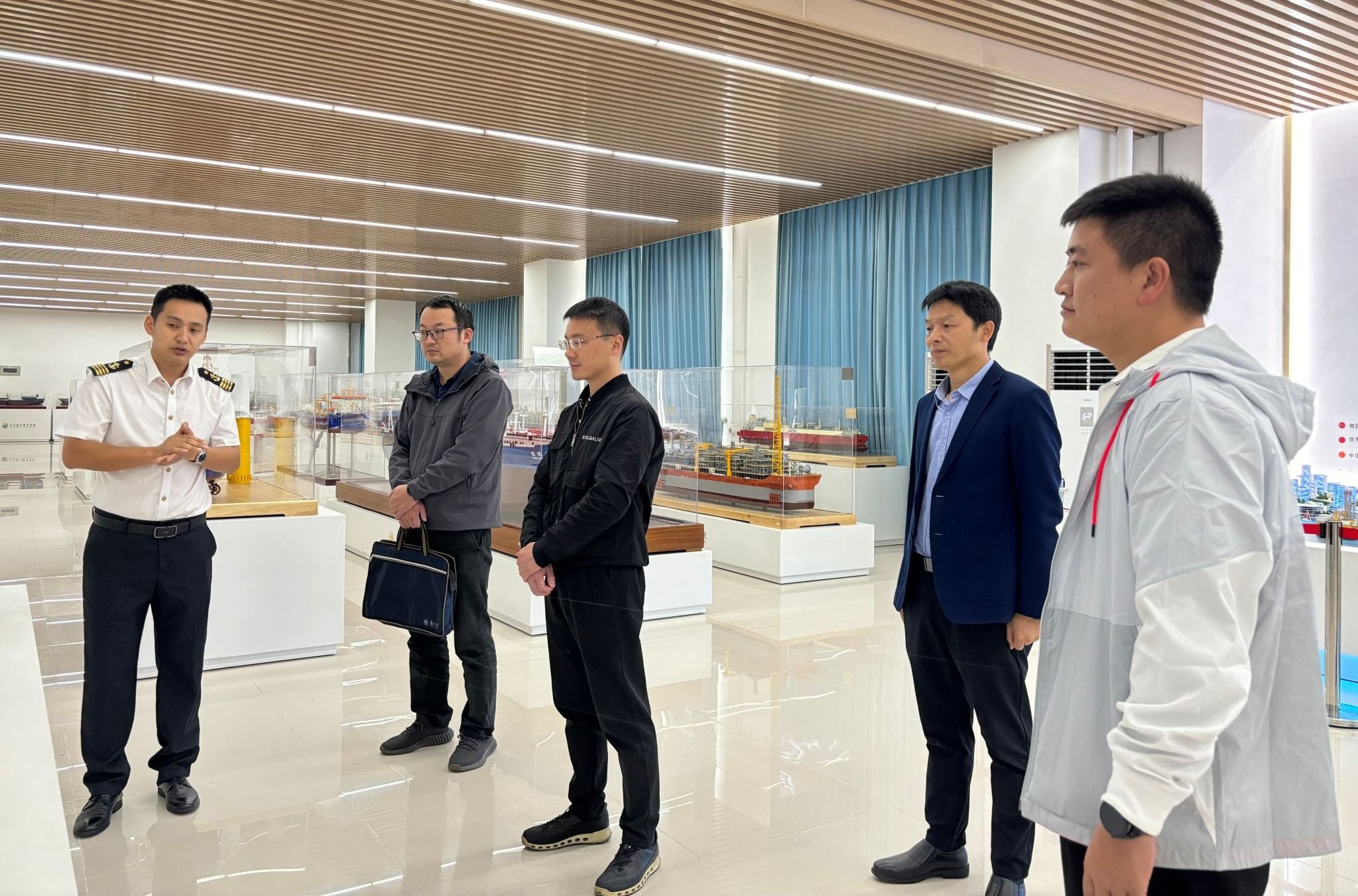 邵院长代表学校对调研组一行的到来表示热烈欢迎,并陪同参观了世界特种船展厅、国防科技馆、退役军人之家、海权红馆、360度视景全任务船舶操纵模拟器等特色场地。
