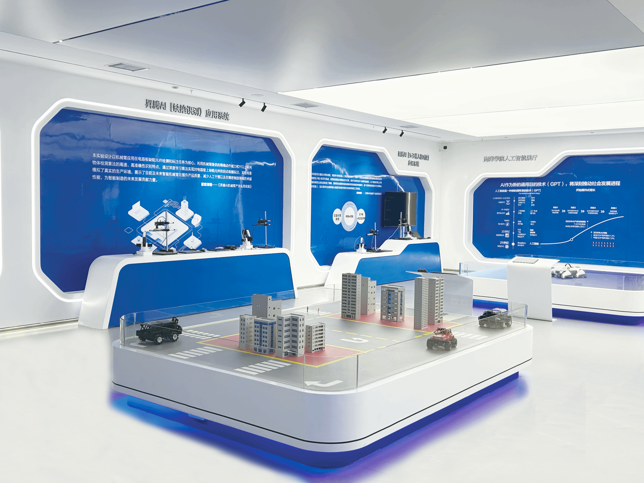 在实践教学层面,学校设计完整的人工智能实践课程体系,建设课程资源和实训中心,从人工智能基础课程《提示设计与大模型应用实践》到自然语言处理(聊天机器人)、NLP文字识别、图像识别、智能驾驶(智能小车)、智能机器人、机械臂等人工智能应用场景的全面覆盖,配套人工智能在多个行业的应用案例,使学生能够全面了解AI、使用AI、创新AI。
