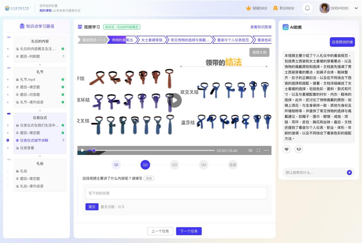 在教师层面,为确保AI课程的教学质量,学校对教师进行了全面培训,帮助教师转变教学模式,使他们能够熟练掌握并应用AI技术获取丰富的教学资源和先进的教学辅助工具,如AI生成题库、教案、思政案例等。同时,智能实时跟踪和分析学生的学习数据和表现,为教师提供准确的教学评估依据。AI助教能够自动化评阅学生的作业和练习,提供虚拟助教、智能问答等辅助工具,24小时在线解答学生问题,显著降低了教师的工作量,教师的角色也从传统的知识传授者转变为学生学习过程中的引导者和协作者。