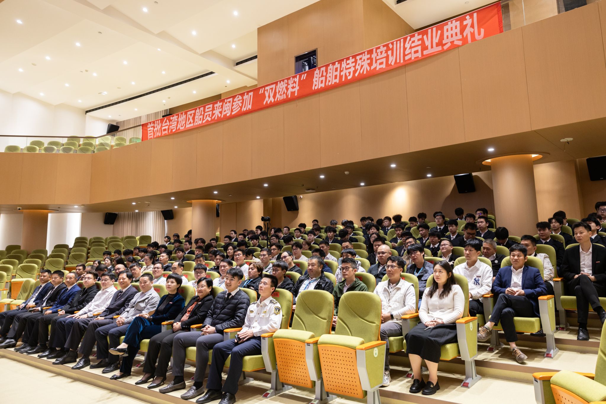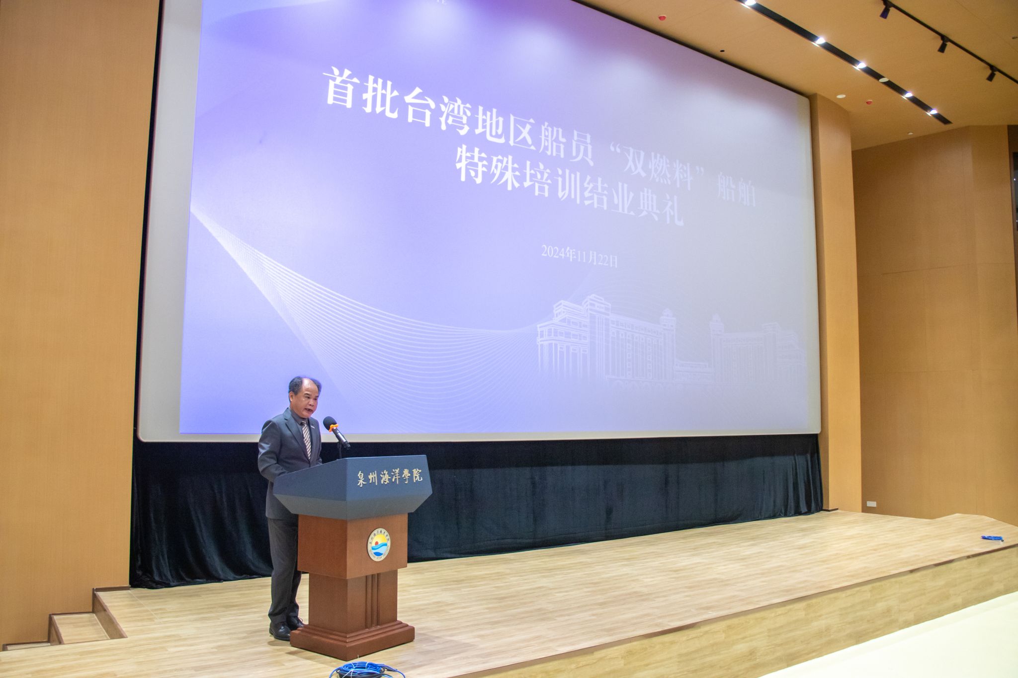 (新闻中心讯 党委宣传部报道)“首批台湾地区船员‘双燃料’船舶特殊培训圆满结业!恭喜所有参训的台湾地区船员以优异的成绩顺利通过了T11和T12特殊培训的考试并取得证书!”11月22日上午,伴随着结业典礼上的一声声祝贺,首批台湾地区船员“双燃料”船舶特殊培训在泉州海洋职业学院圆满落下帷幕。福建海事局船员管理处副处长林祥仲,泉州海事局副局长王烽,泉州海洋职业学院校领导共同出席结业典礼。泉州海洋职业学院副校长刘锦辉主持结业典礼。