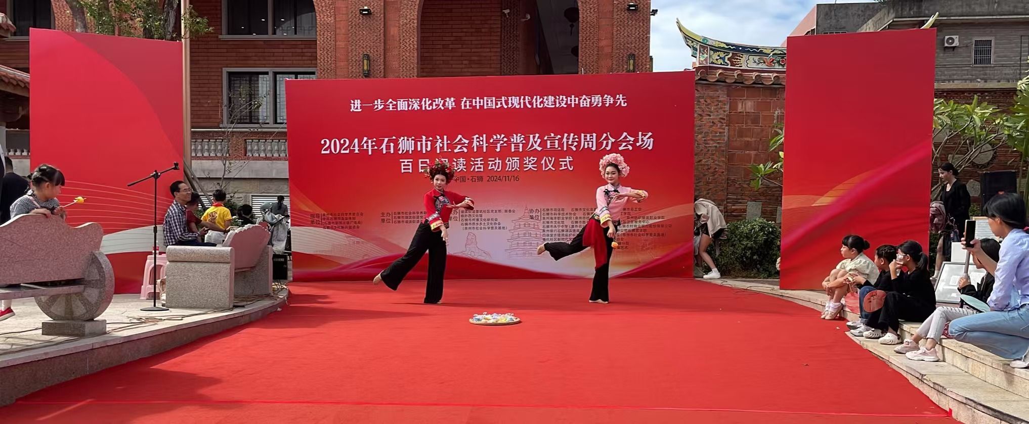 学校科技处积极响应石狮市社科联的号召,组织艺术体育学院的专业教师,悉心指导学生参与石狮市科技周活动。10月16日,副校长钱学东亲自带领科技处成员及两位表演学生,前往石狮市杨孙西文化馆。在活动中,我校学生带来的《汐・簪花送嫁》节目惊艳全场。他们用优美的舞姿生动展现了泉州地区独特的民俗文化和海洋文化,赢得了观众们热烈的掌声与高度赞誉。