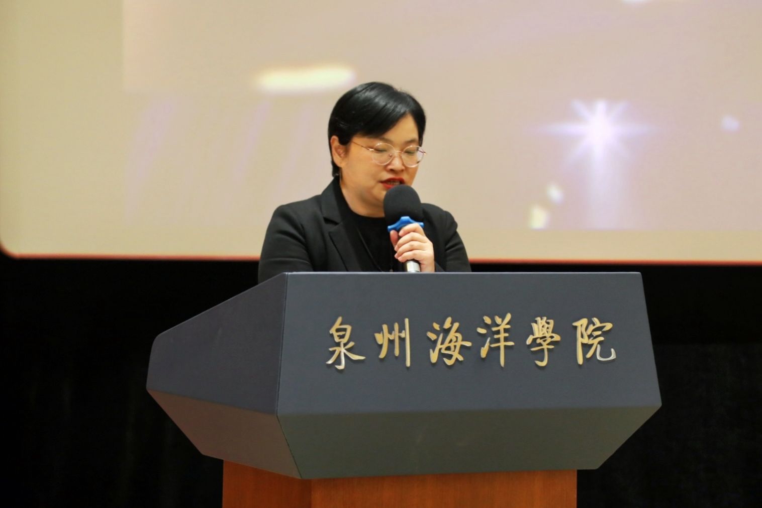 常务副校长唐学学在致辞中对获奖同学表示热烈祝贺。她表示,此次电影展不仅用影像的力量让大家感受到了艺术的魅力,同时也看到信息工程学院学子的专业技能和创新思维,充分彰显了信工学子的活力与积极向上的精神风貌。同时,她也寄语影编专业的学子们不忘初心、牢记使命,坚守“传媒是社会的良知”的责任,并鼓励大家勇敢追梦,为泉海的发展贡献青春力量。