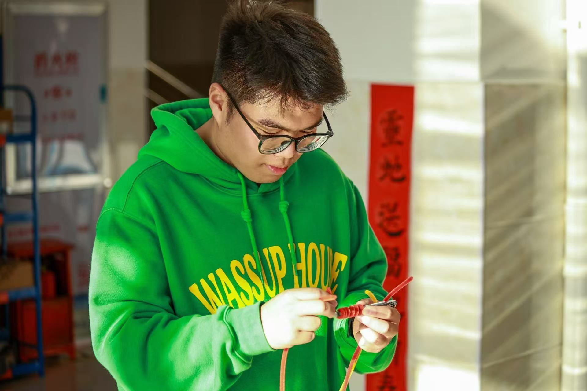随着游园之旅缓缓步入第七站——11号学生宿舍楼1楼大厅,也寓意着游园之旅接近尾声。在这里,参与者们化身为工匠,利用扭扭棒制作灯笼,灯光与笑声交织,温馨与欢乐共存,为游园之旅画上完美句号,同时,在每个人心中播下了对传统文化的热爱与传承的种子。