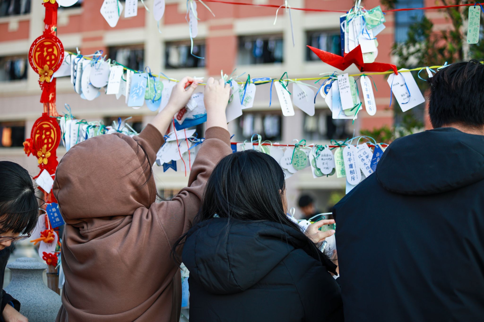 游园之旅的第三站,引领着同学们来到了7号学生宿舍楼与学生街交汇处的那棵心愿树下,同学们在心愿卡上镌刻新年愿景,每一个字都满载着同学们对未来的憧憬与理想的执着。随后,他们“走进”智慧泉海APP中的泉海社区,分享心愿,共话梦想。