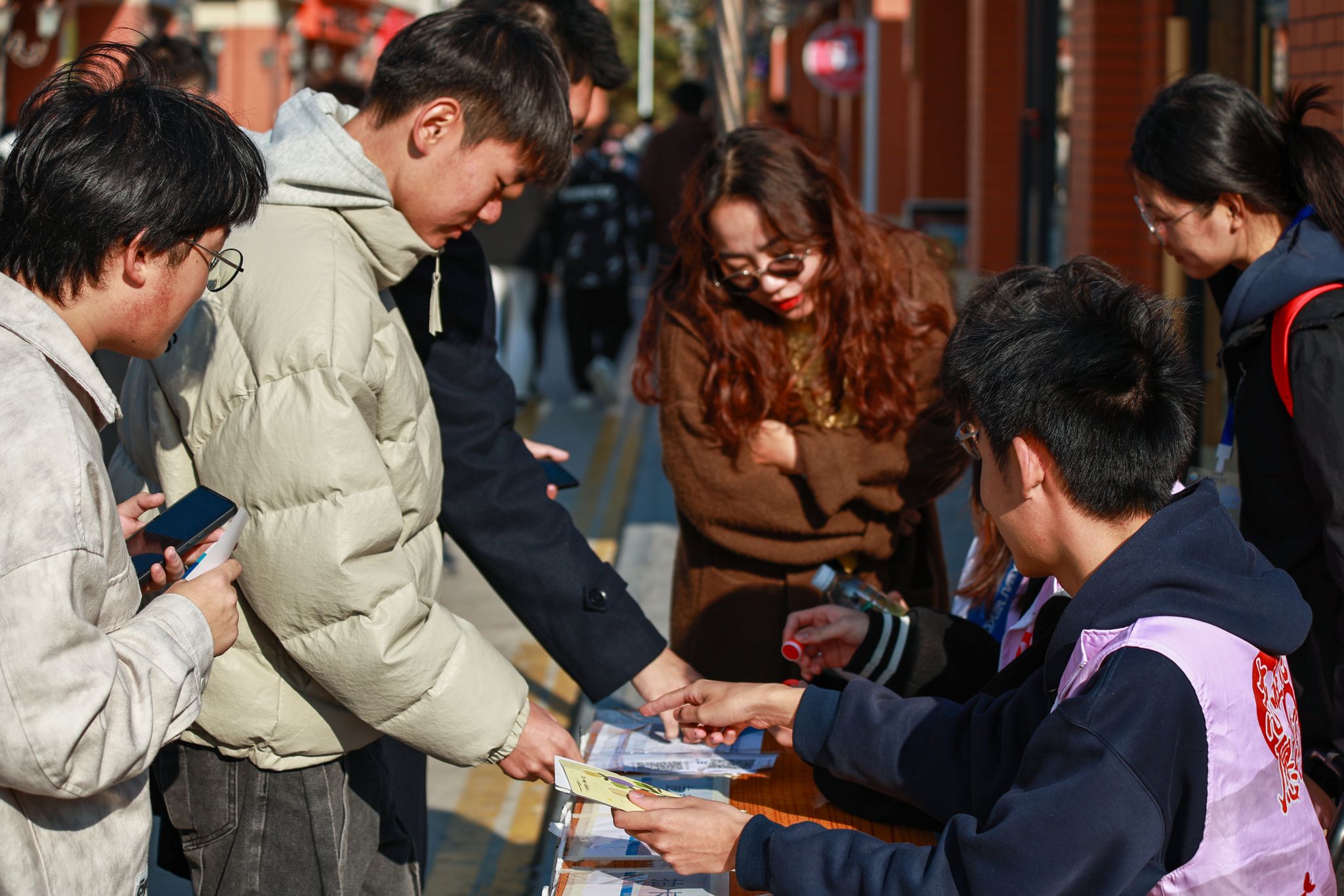 游园之旅的第四站来到了繁华的学生街瑞幸咖啡旁,问答卡堆中,参与者们随机抽取卡片,解答国家资助政策的知识迷宫,对资助政策收获满满。
