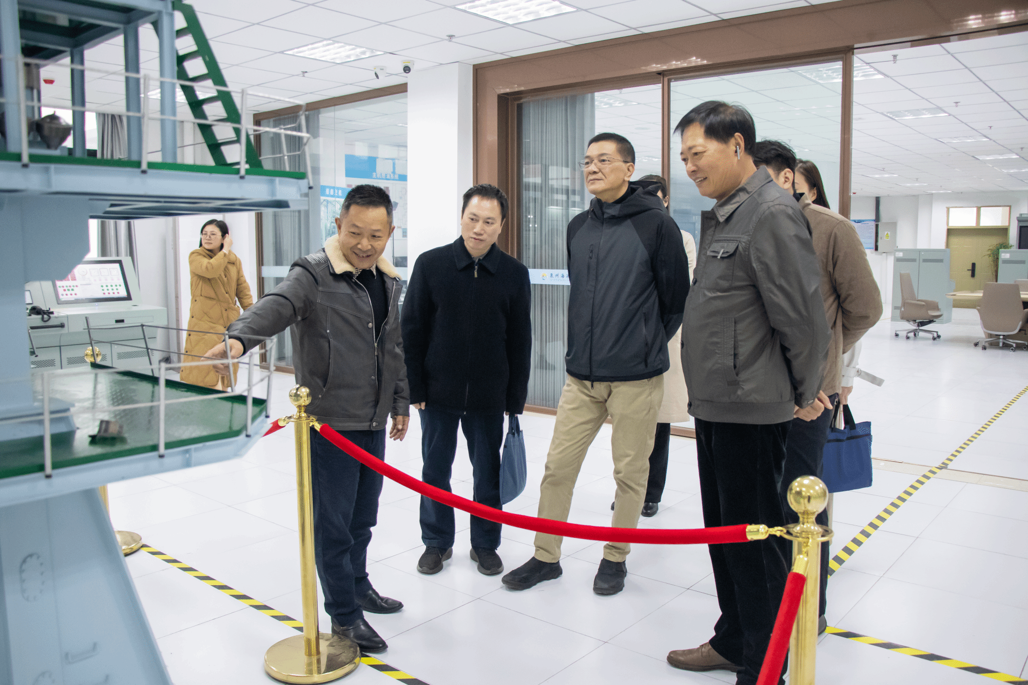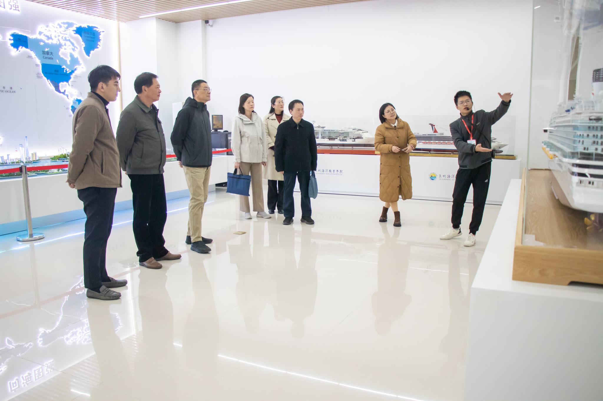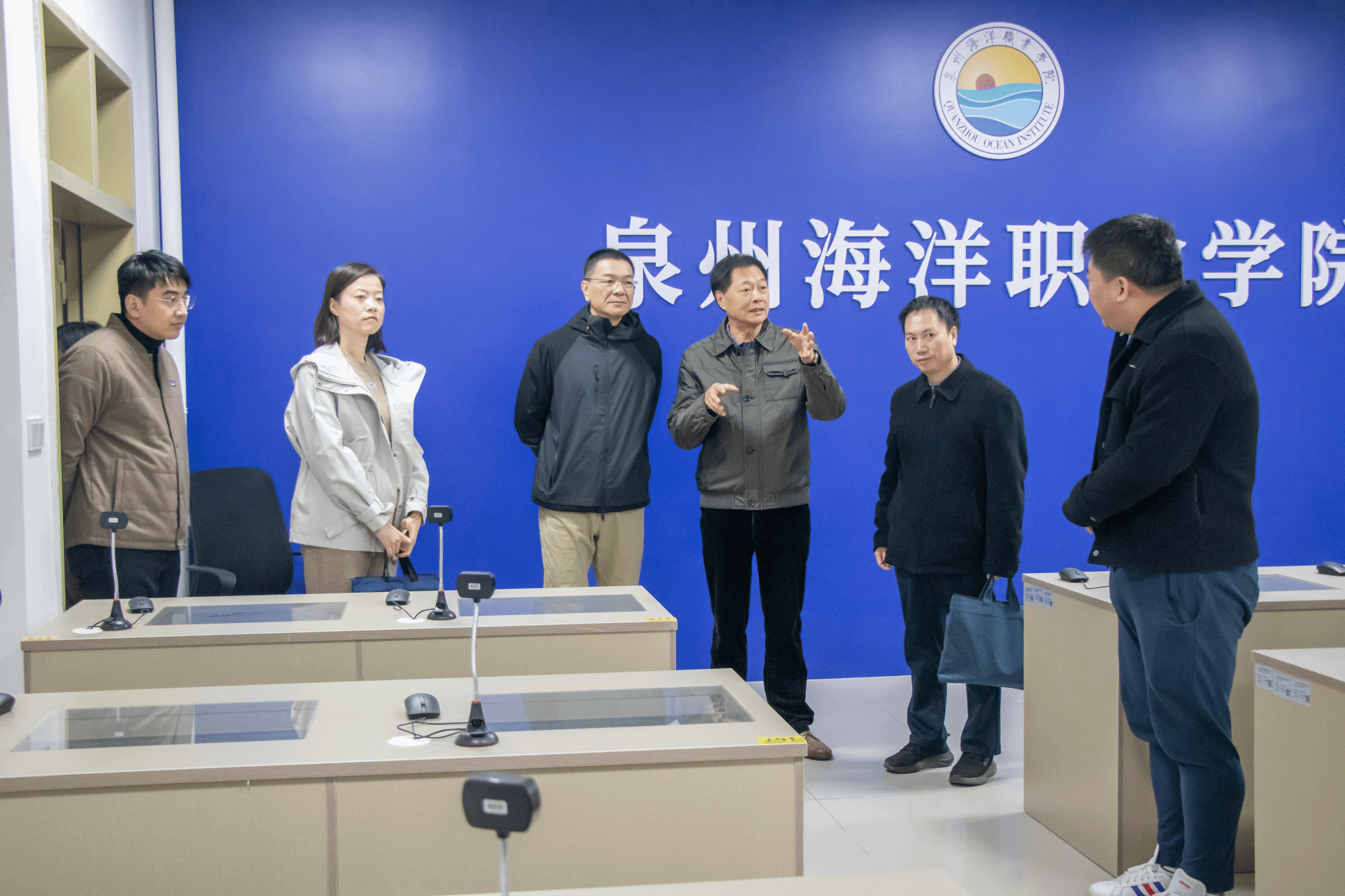 李俊玮一行参观了船员培训综合楼、学校世界特种船舶展示厅、VLCC轮机实训中心、科大讯飞同声传译智慧教室、海权红馆、360°全视景航海船舶操纵模拟器、退役军人之家、国防科技馆等学校特色场馆,围绕船员培训、课程思政、AI课程研究、实训设备、实训课程安排、退役军人政策宣传等方面深入了解办学特色和人才培养特点。同时,李处长一行深入三创基地和继续教育学院,实地考察“中经海农”电商平台、普通话水平测试站等场所,就如何提高学生就业竞争力进行深入探讨,体现了对青年学子成长成才的高度重视。调研过程中,李处长对学校近年来取得的发展成果表示了高度认可,并针对学生就业与创业工作中的问题与挑战,提出了具有针对性的建议。