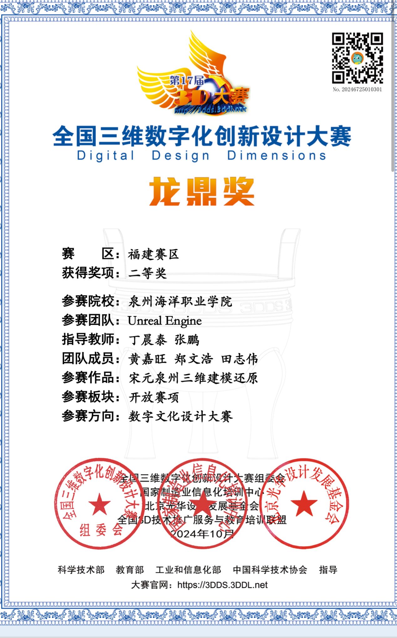 (新闻中心讯 信息工程学院供稿 党委宣传部报道)近日,第17届全国三维数字化创新设计大赛落下帷幕。信息工程学院教师丁晨泰指导学生孙杉杉、杨晓萍作品《山海经系列手办设计》荣获福建赛区“特等奖”;张鹏、丁晨泰老师指导学生黄嘉旺、郑文浩、田志伟作品《宋元泉州三维建模还原》荣获福建赛区“二等奖”。