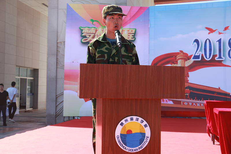 2018级新生代表肖利前同学上台发言,他对学院领导、全体教官和辅导员老师在军训期间对新生们的付出表示感谢,表示将以军训为起点,以昂扬的风貌面对崭新的开始。轮机系辅导员陈绍勇老师代表教师上台发言,对2018级新同学的到来表示欢迎,也希望同学们“以梦为马,不负韶华”。