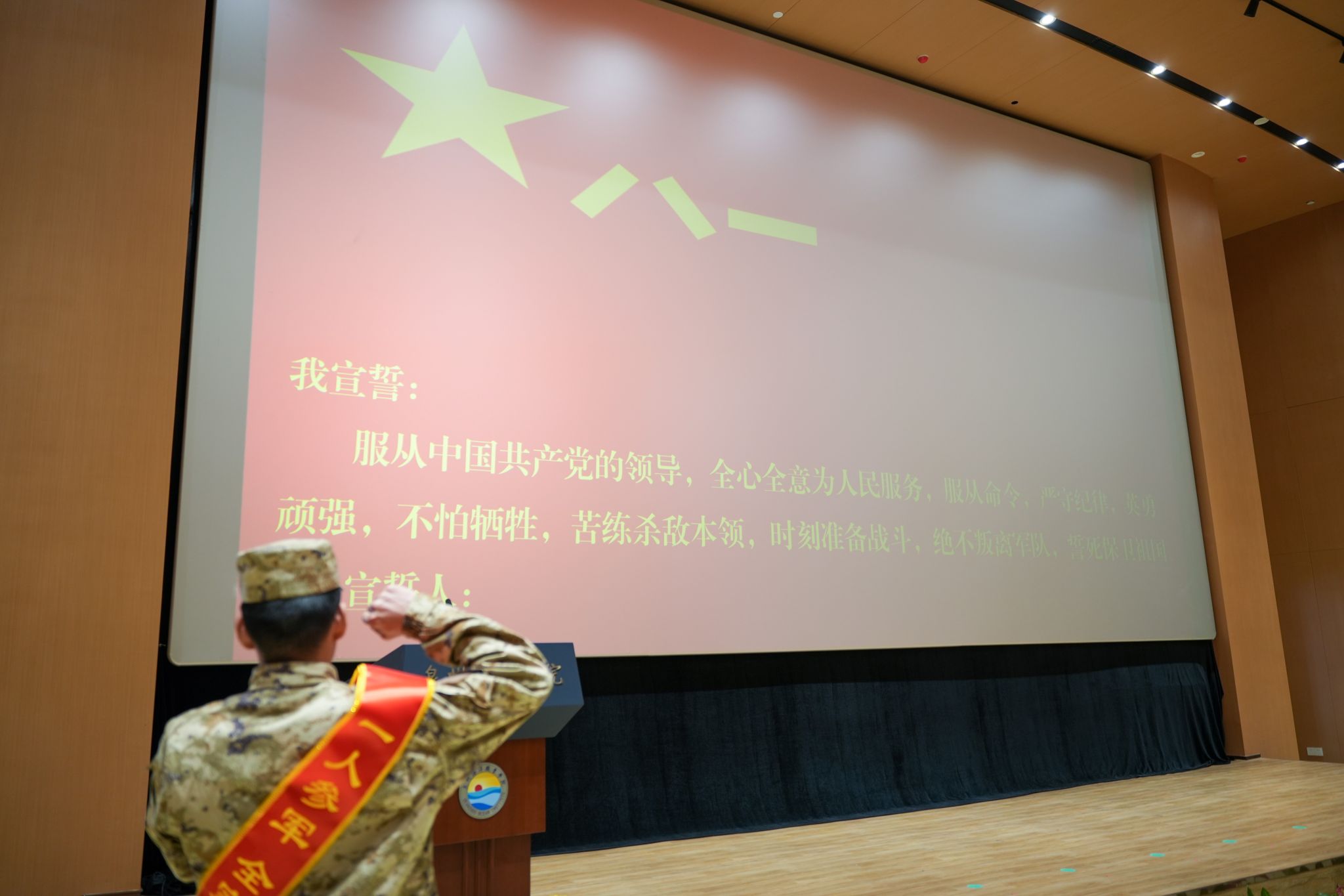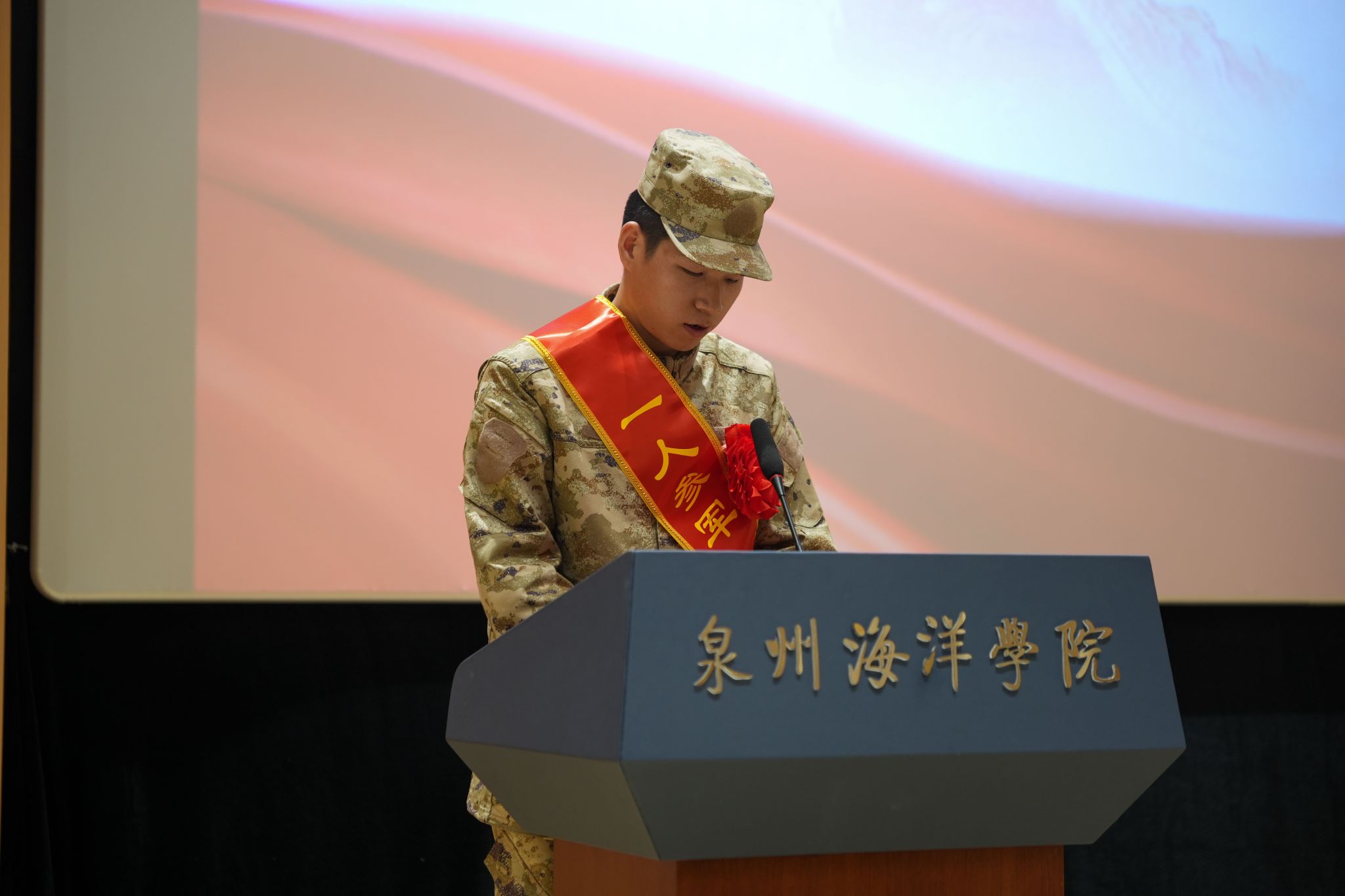 准军人代表——国防教育学院袁军帅同学代表全体战友庄严承诺:将以赤子之心践行使命,严守纪律、刻苦训练,以钢铁纪律锤炼意志,以过硬本领铸就荣光。请党和人民放心,我们定当牢记“忠诚于党、热爱人民、报效国家”的誓言,不负韶华、不辱使命!