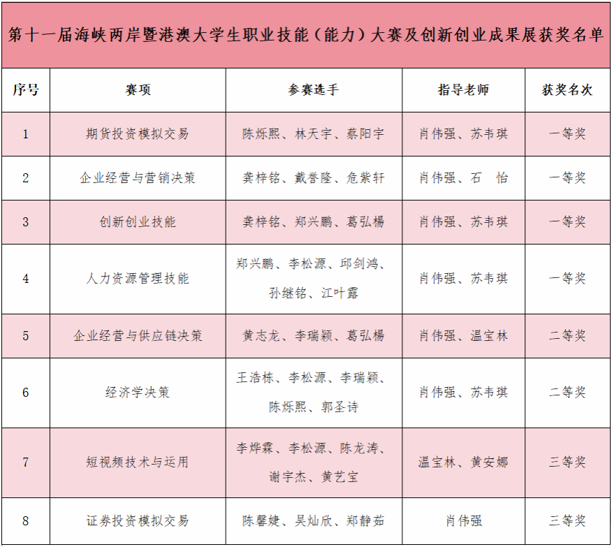 (新闻中心讯 校团委供稿 党委宣传部报道)日前,福建省教育厅公布第十一届海峡两岸暨港澳大学生职业技能大赛及创新创业成果展获奖名单。我校学子凭借扎实的专业技能与创新实践能力,共斩获8个奖项:其中,一等奖4项、二等奖2项、三等奖2项,进一步彰显了我校学风建设成效。