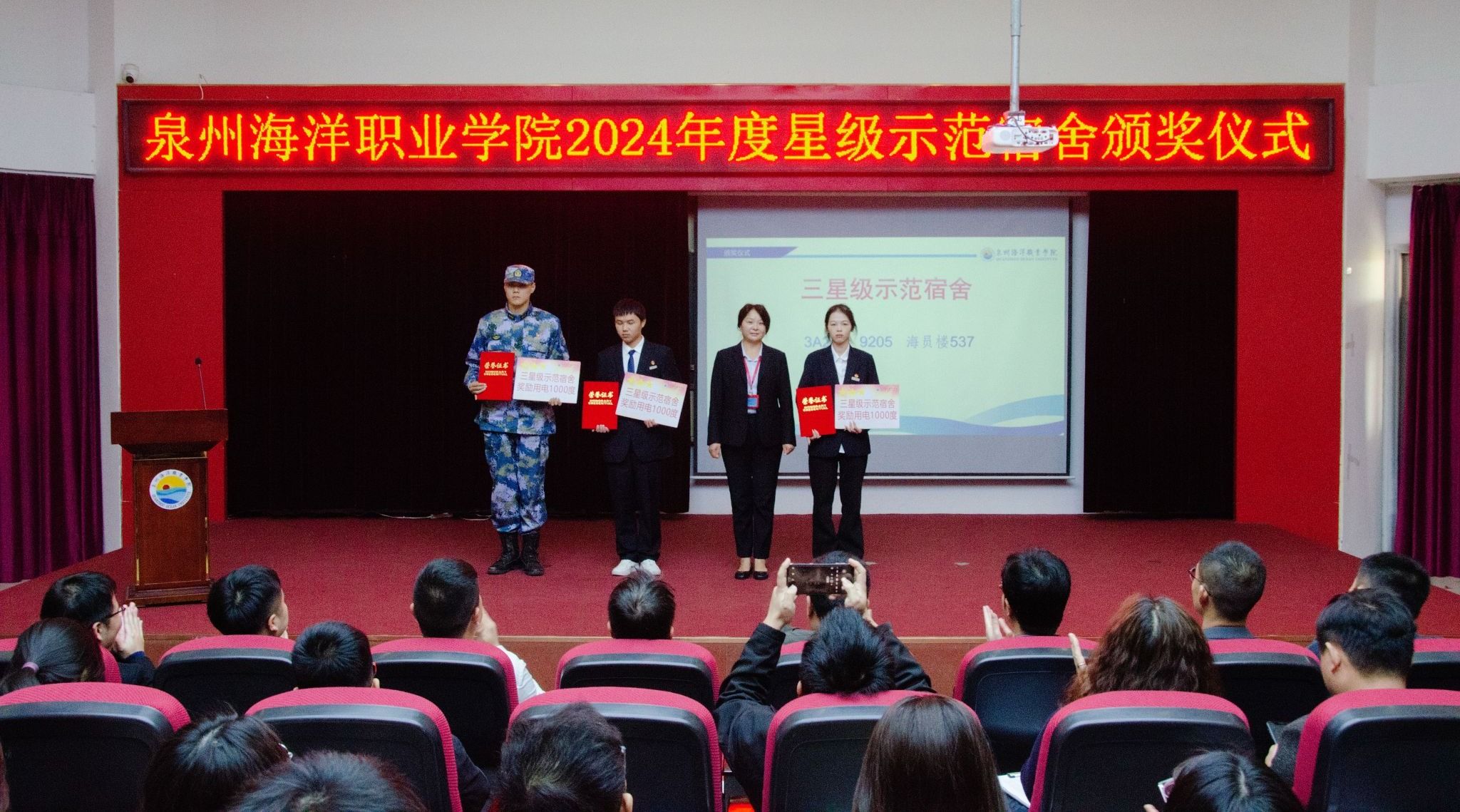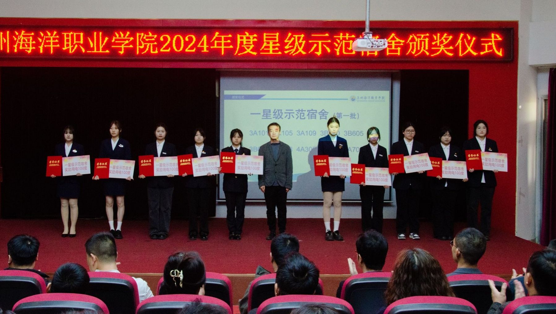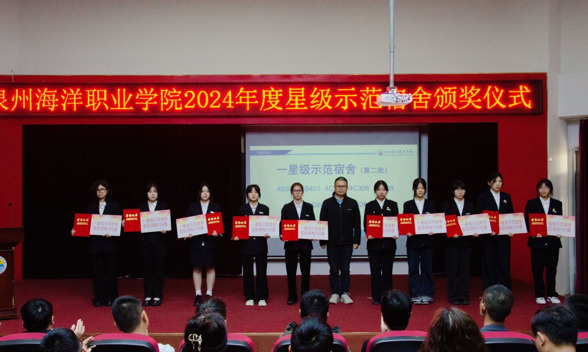 (新闻中心讯 党委学工部供稿 党委宣传部报道)以文明促成长,以标杆树新风,以示范促建设。4月3日,学校举行2024年度“一站式”学生社区安全文明宿舍暨“星级示范宿舍”颁奖仪式。党委学工部、后勤处和各二级学院相关负责人与师生代表齐聚一堂,共同见证68间星级宿舍的荣誉时刻。本次活动旨在深化“三全育人”综合改革,推进宿舍标准化建设,营造安全、文明、和谐的校园生活环境。