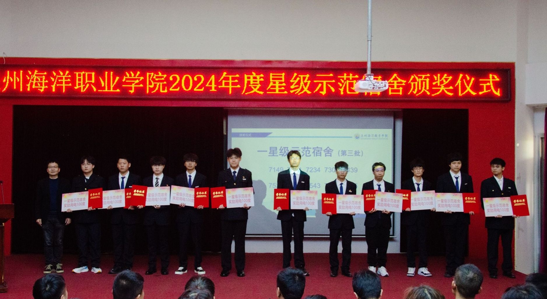 表彰仪式现场,党委学工部副部长、校团委书记余斐虎宣读了表彰决定。经严格评审,全校共评选出68间“星级示范宿舍”,其中三星级宿舍3间、二星级宿舍7间、一星级宿舍58间。这些宿舍在安全卫生、文化氛围、学风建设等方面均表现突出,成为校园文明建设的标杆。