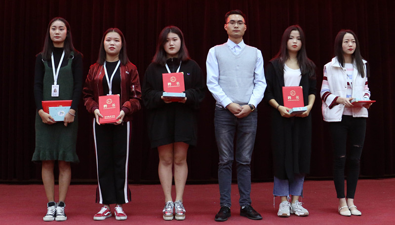 致辞后,由党政办李婷婷老师向记者团新干事颁发聘书,由继续教育学院龙先相老师向记者团新团干颁发聘书,由继续教育学院柯阿斌老师向优秀干事颁发荣誉证书。随后团长尚双星带领着新干事们进行宣誓。