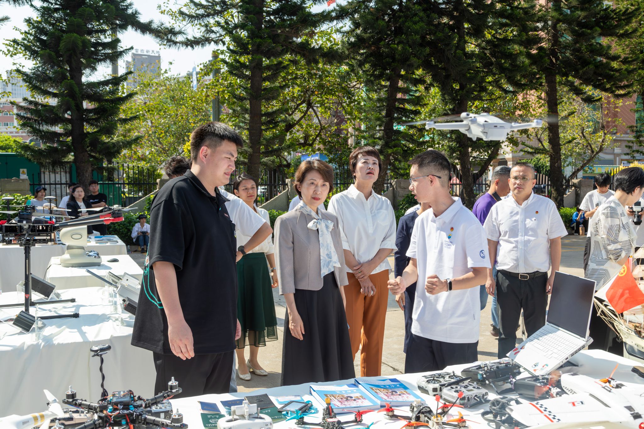 活动中,我校无人机社团及无人机赛队展示了科技实践成果。讲解员李松源介绍了社团的特色活动,包括低空经济科普、空域智慧巡检、校企合作“订单班”培养模式及影视航拍实训等,并分享了无人机技术在社会服务中的应用案例,体现科技与创新的结合。社团成员还现场演示了无人机起飞、悬停、降落等操作,展现了团队的专业技术能力。