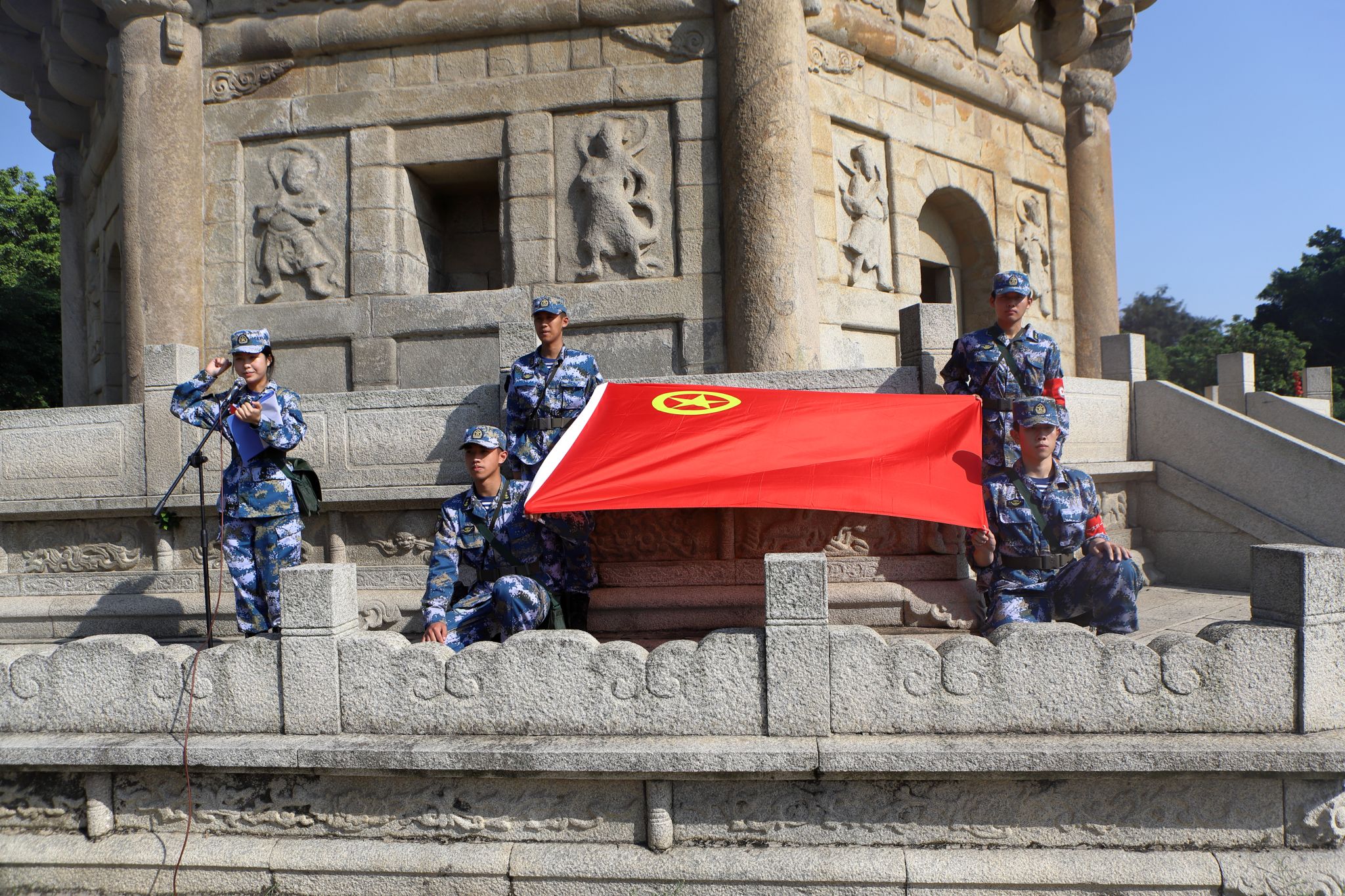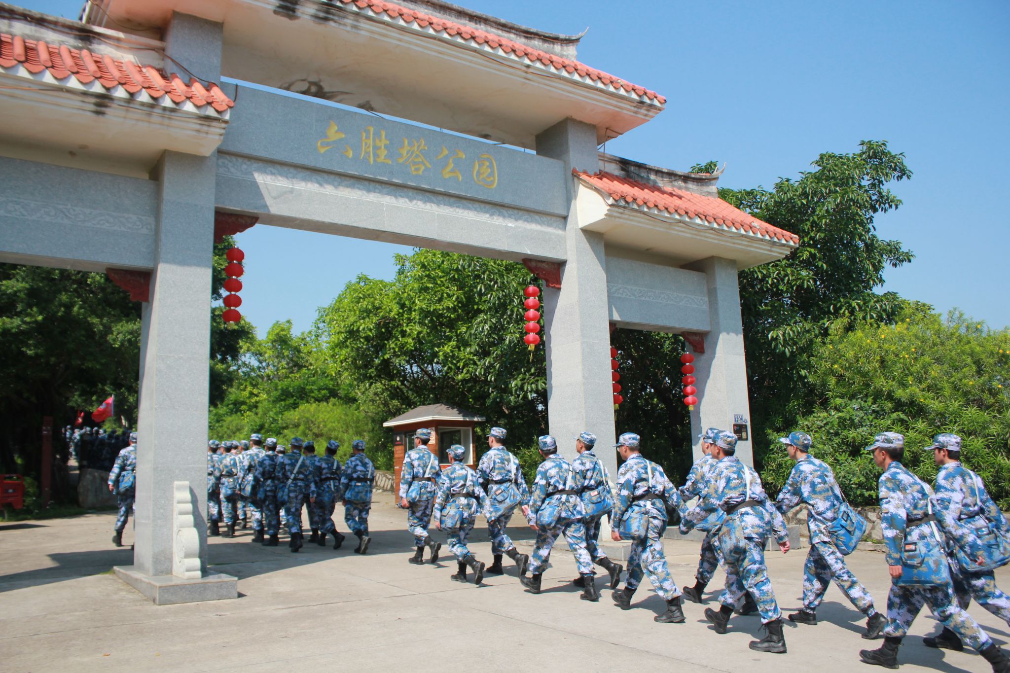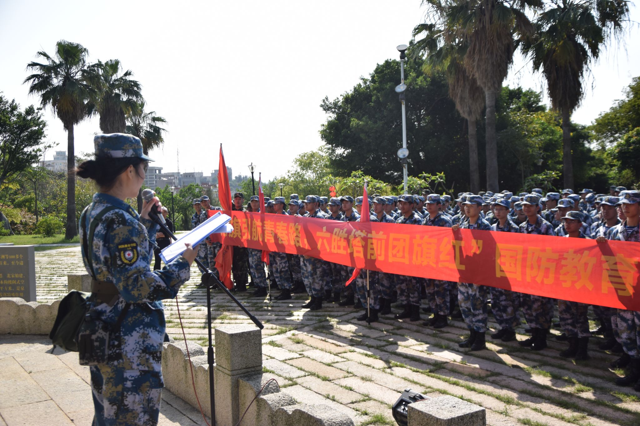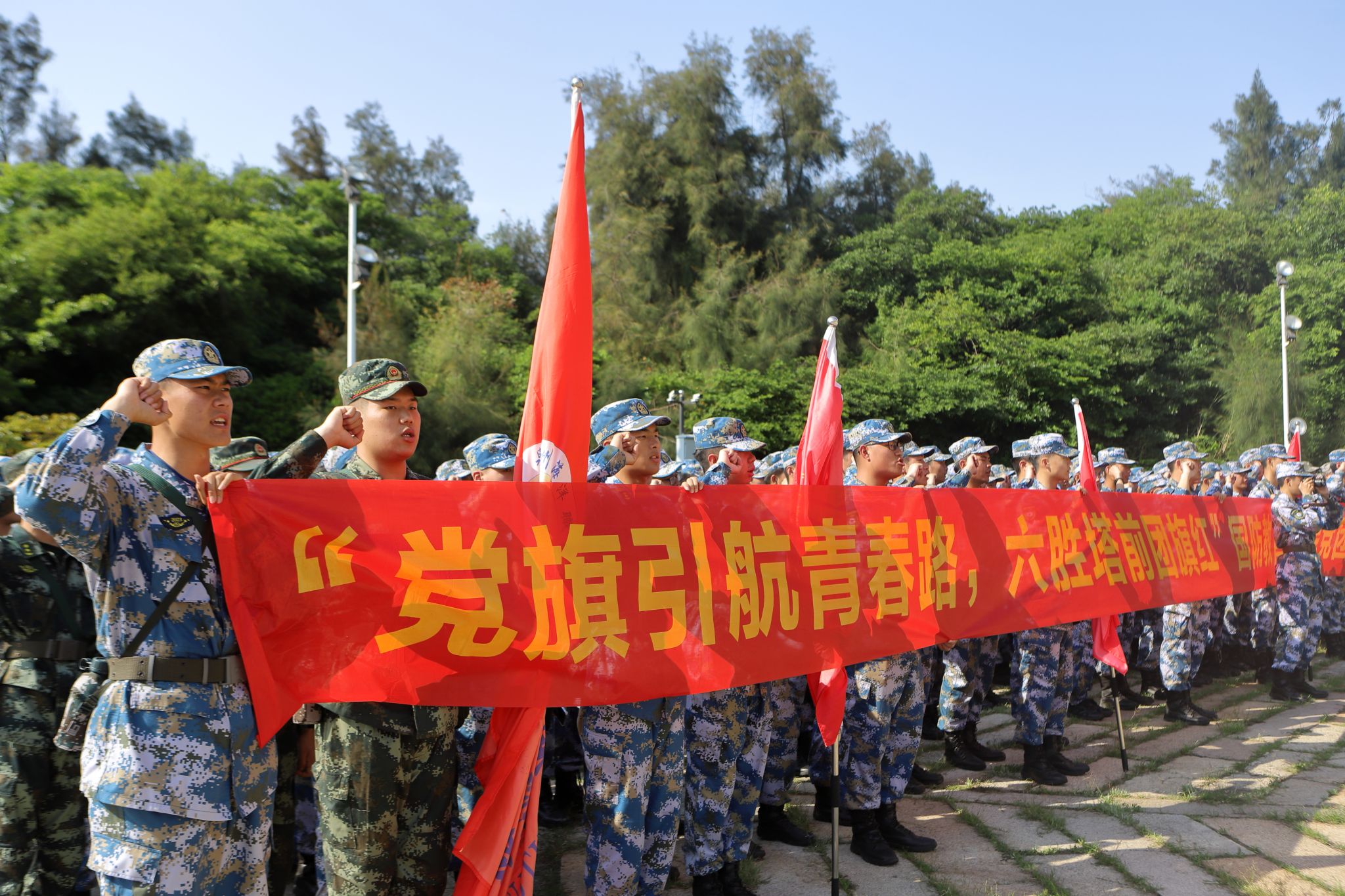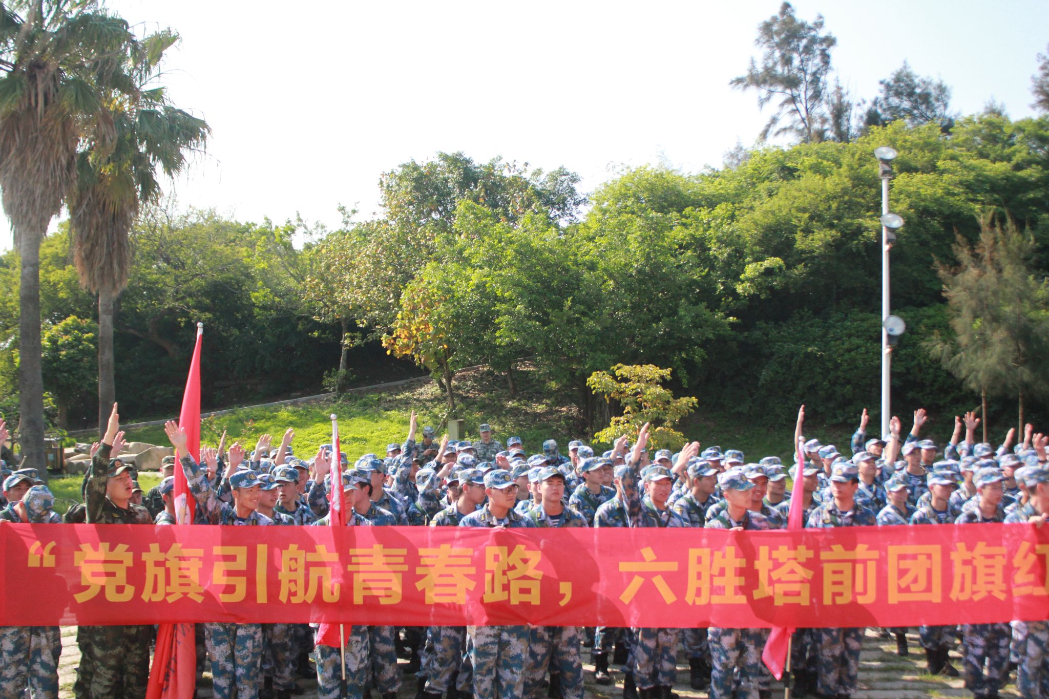 在六胜塔前,全体学员面向团旗高举右拳,重温入团誓词,并举行“立志国防,献身国防事业”宣誓仪式。铿锵有力的誓言回荡在碧海蓝天之间,学生们神情庄重,眼神中透露出对国防事业的坚定向往。