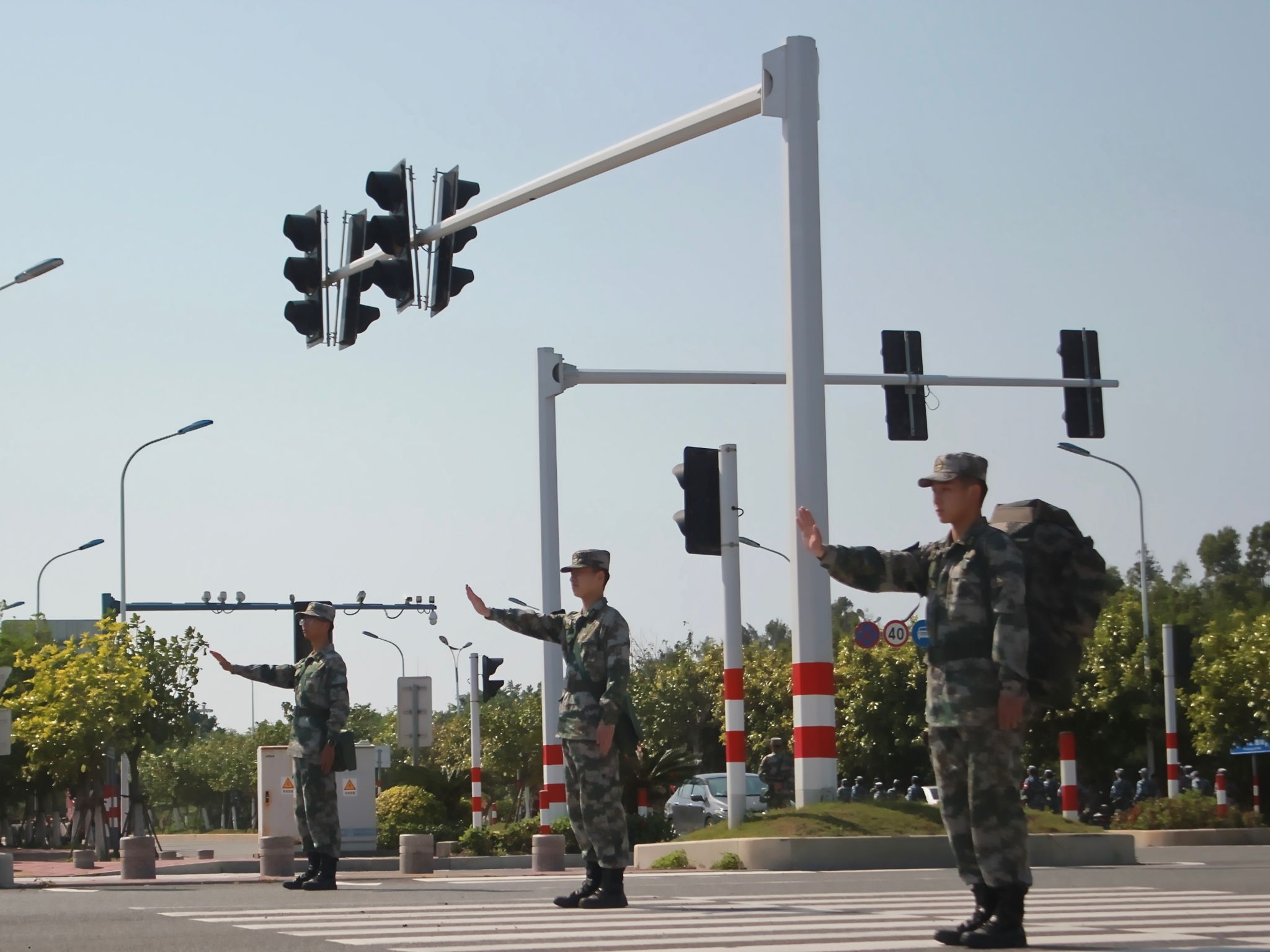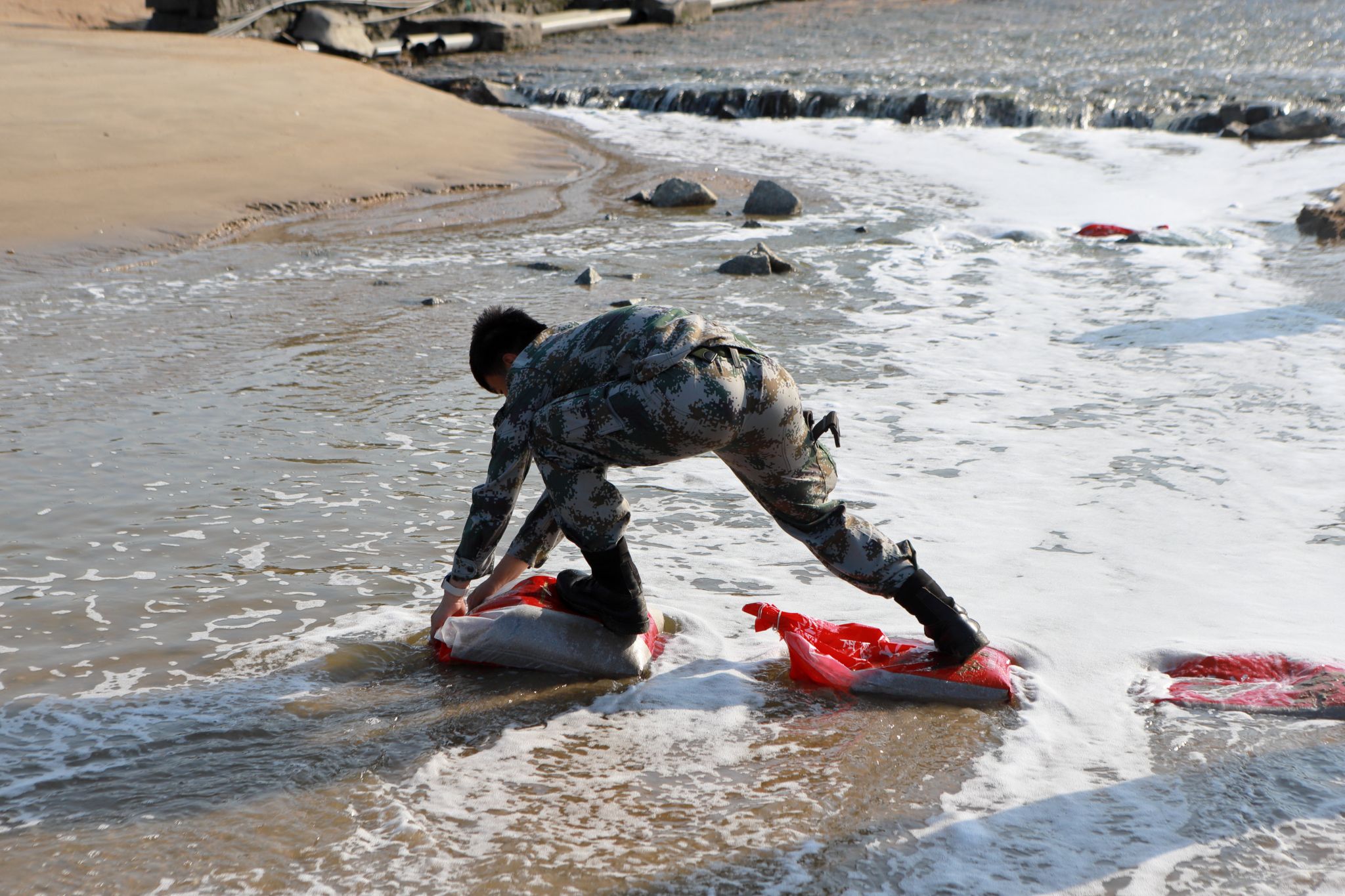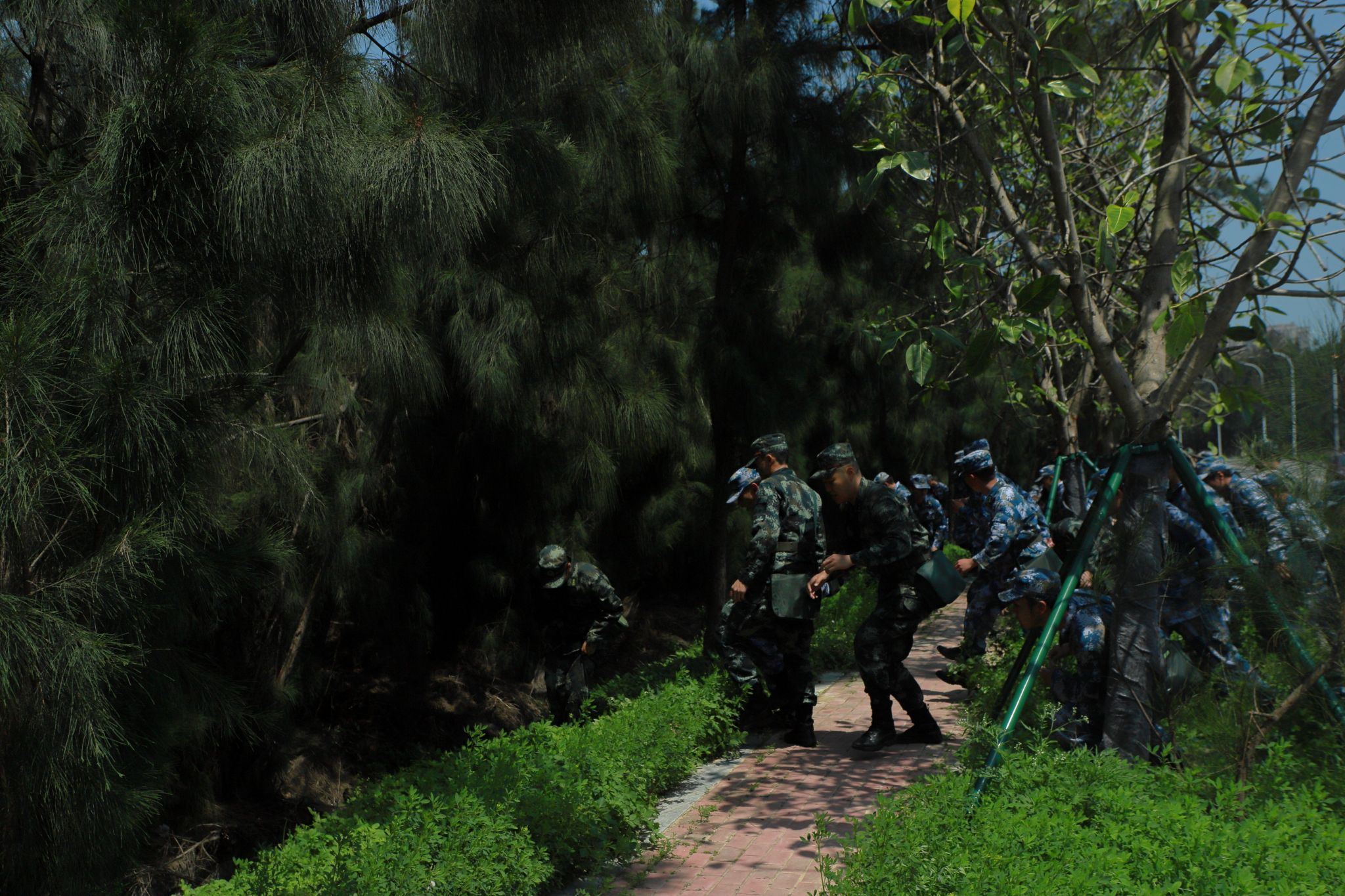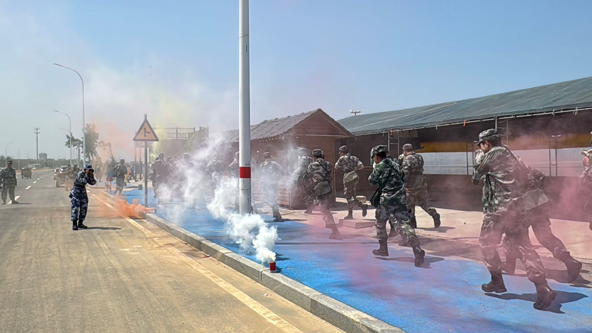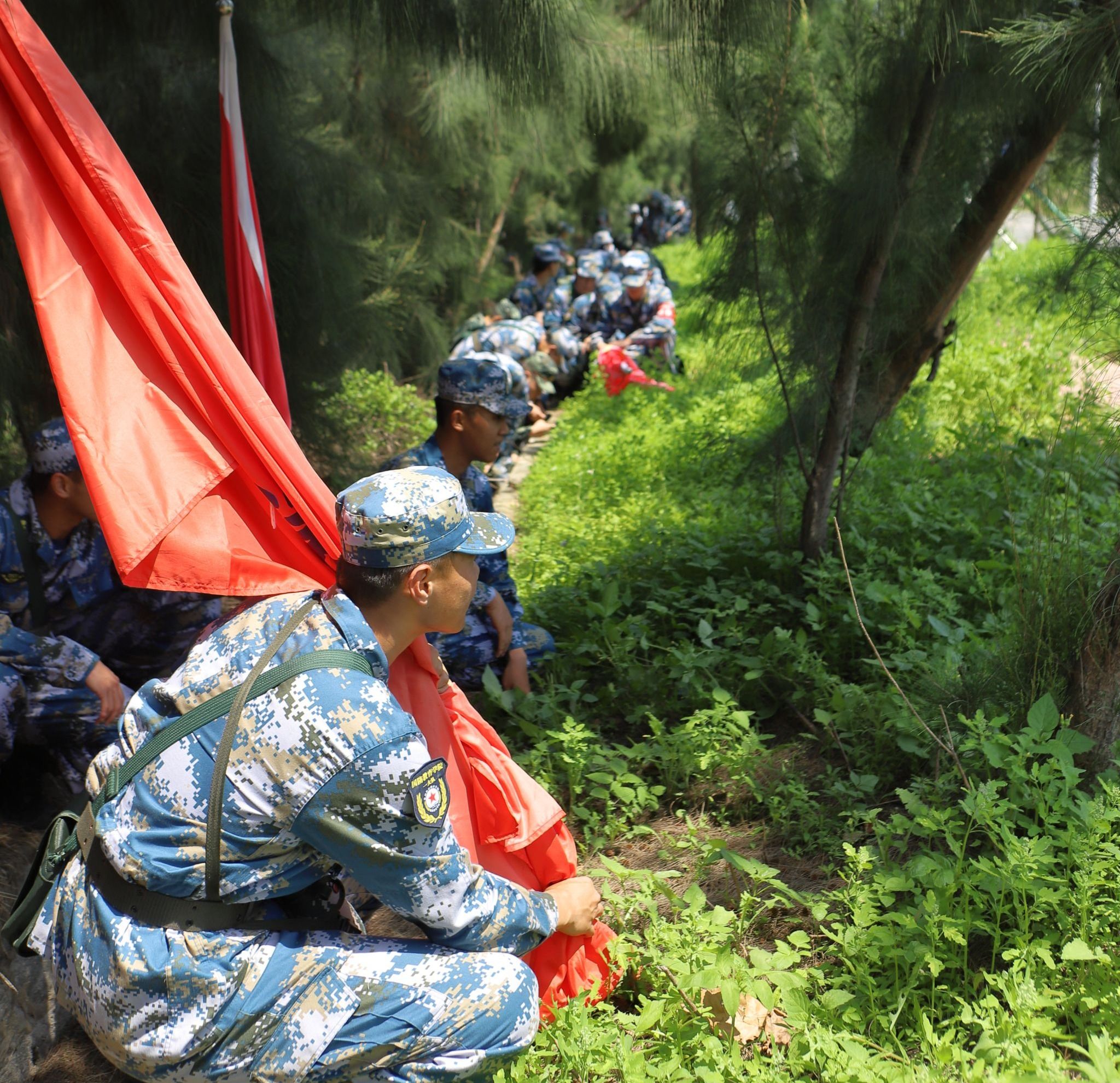 行军途中,模拟实战场景穿插进行。行至沿海区域,突如其来的“空袭警报”划破长空。教官即刻通过对讲机传达预警。各大队迅速反应,以中队为单位,利用树林、沟壑等地形隐蔽。他们压低身形,关闭通讯设备,保持绝对静默,确保无反光物品暴露目标。待警报解除,队伍以沙滩跑操迅速恢复建制,展现出过硬的单兵素养与协同能力。