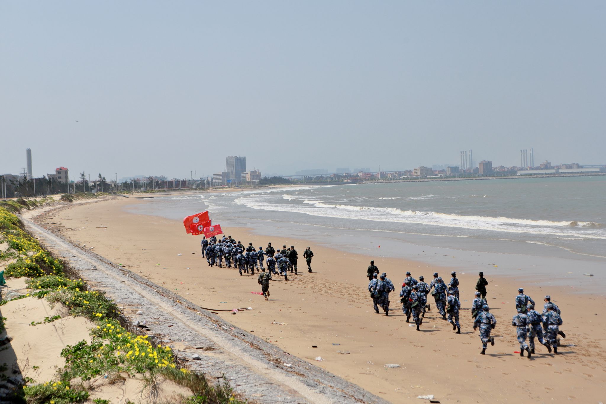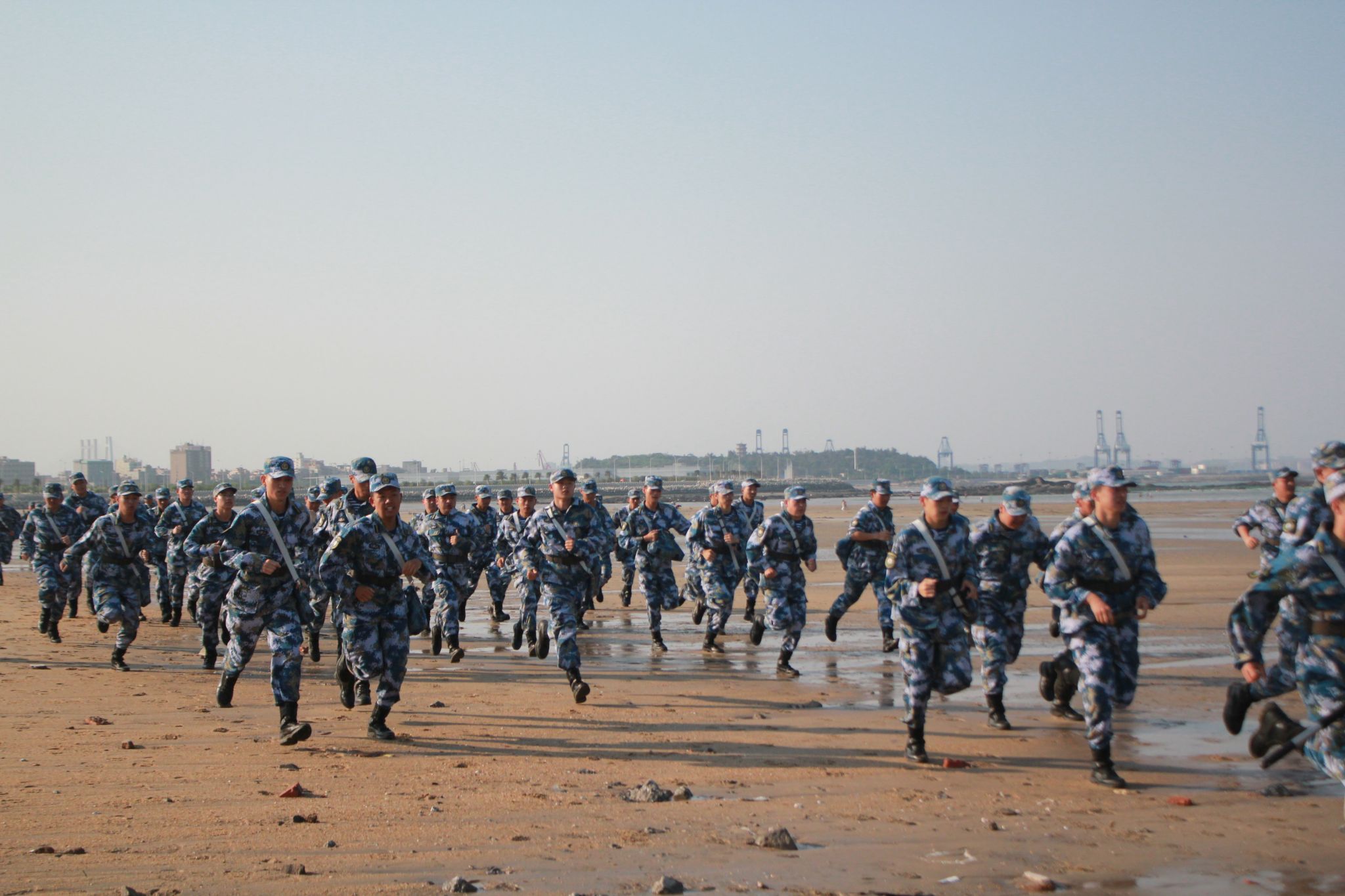 沙滩跑操环节,黄俊杰教官下达警报指令,学生们迅速应对,随后在沙滩上跑出整齐划一的步伐,彰显出团队协作精神。