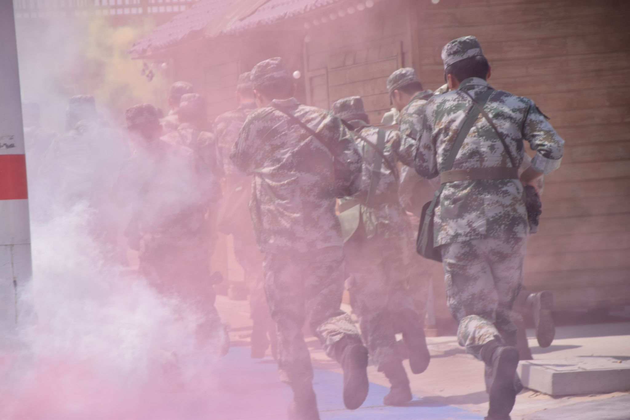 当模拟“染毒地带”特情突现时,一大队尖兵班手持设备率先突入。确认污染区域后,全体人员立即用衣物遮盖暴露部位,在值班员指挥下调整路线绕行。通过污染区后,学员们以口令密码传递完成“洗消”指令,整套处置流程精准高效,体现出良好的应急处置能力。