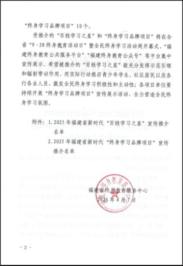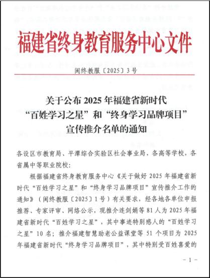 (新闻中心讯 继续教育学院供稿 党委宣传部报道)日前,福建省终身教育服务中心公布了2025年福建省新时代“百姓学习之星”和“终身学习品牌项目”名单,我校《戎耀续航·智学行》入选2025年福建省新时代“终身学习品牌项目”。