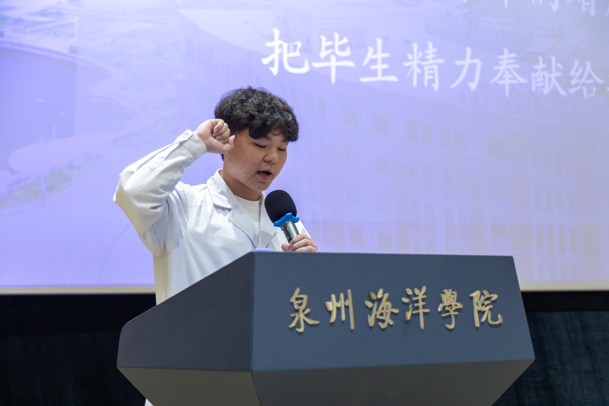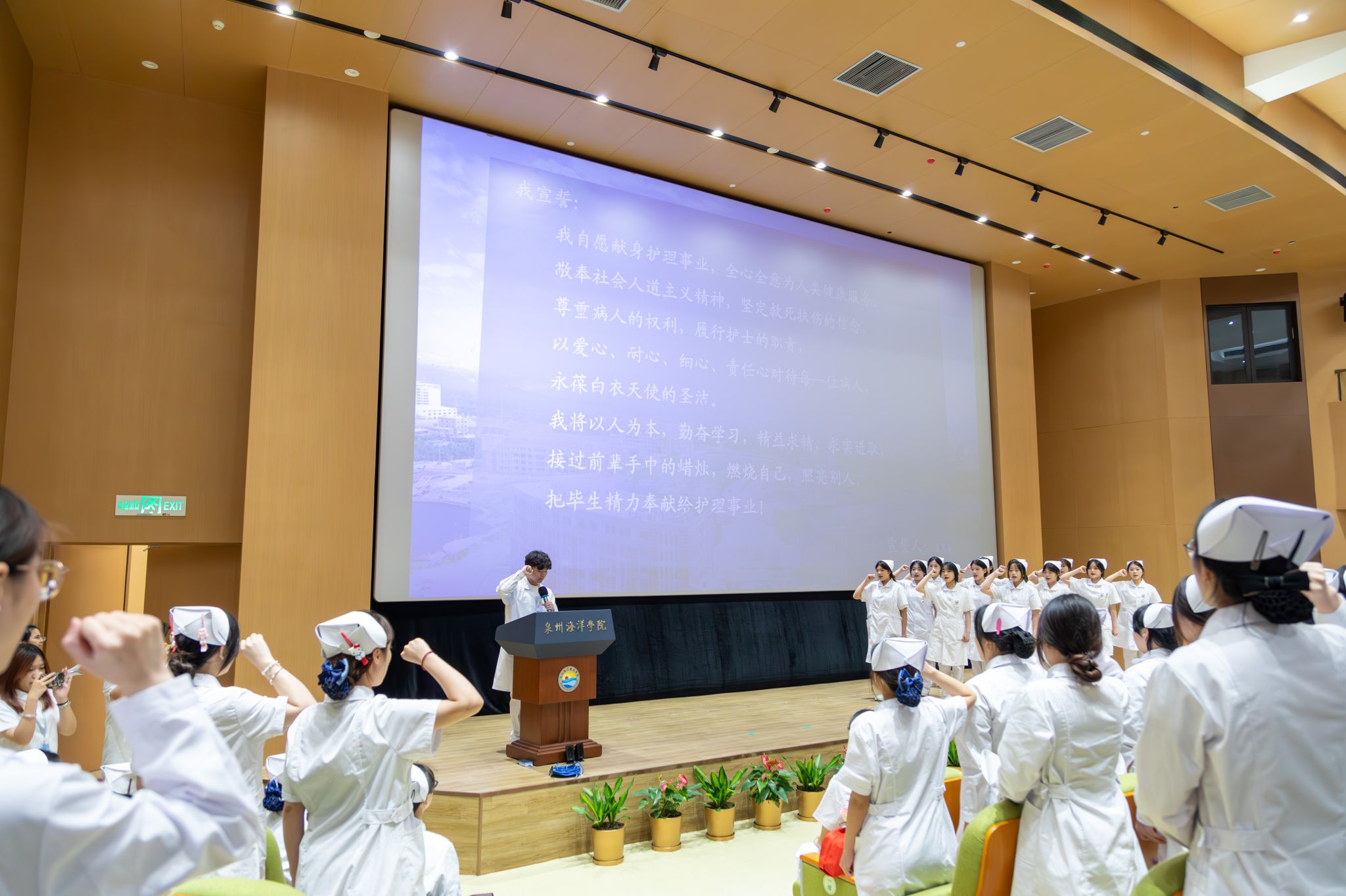 护理专业学生代表刘桂成带领同学们高举右拳进行宣誓。