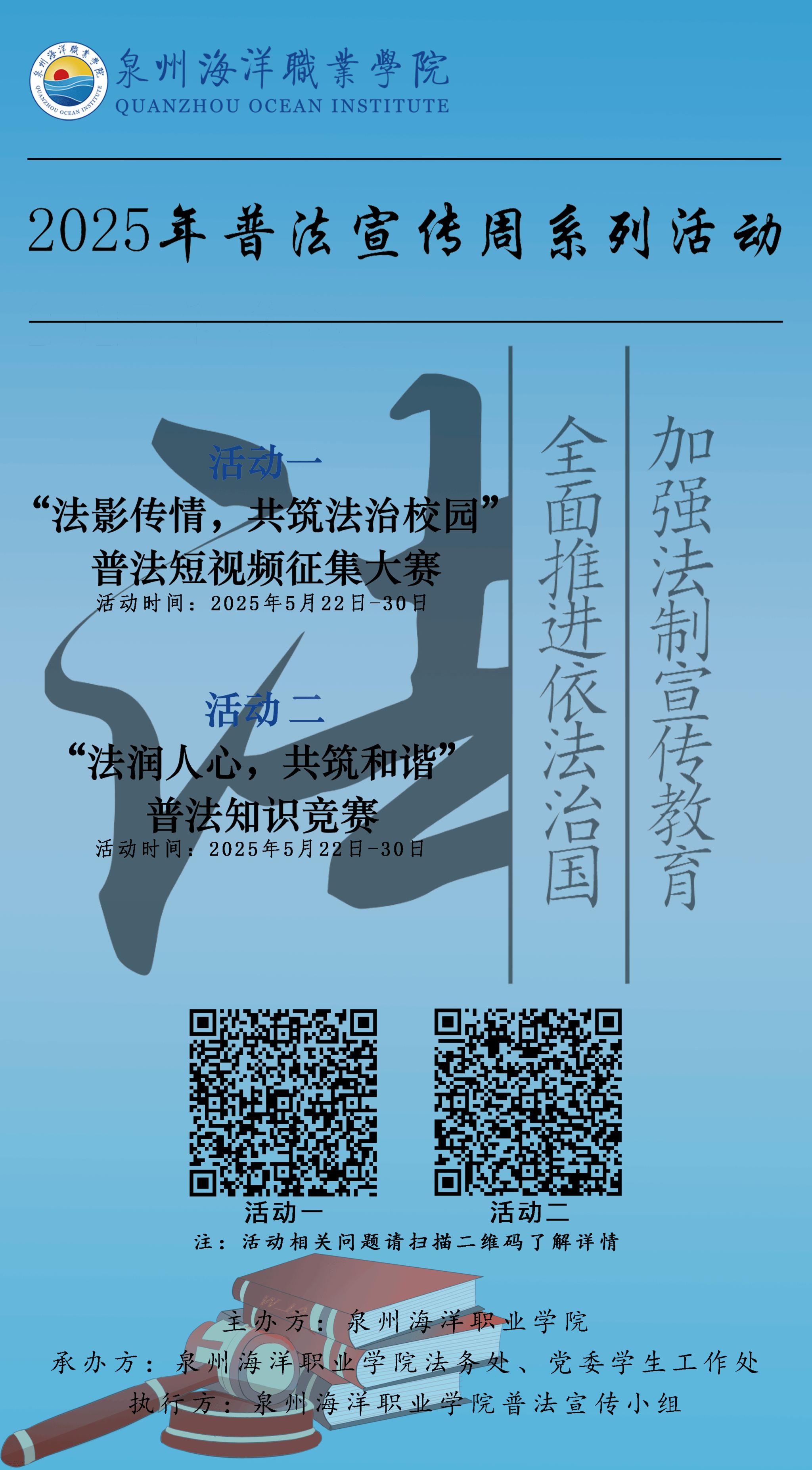(新闻中心讯 法务处供稿 党委宣传部报道)法治之光闪耀校园,普法之花绚烂绽放。5月22日,泉州海洋职业学院2025年普法宣传周系列活动正式启动。